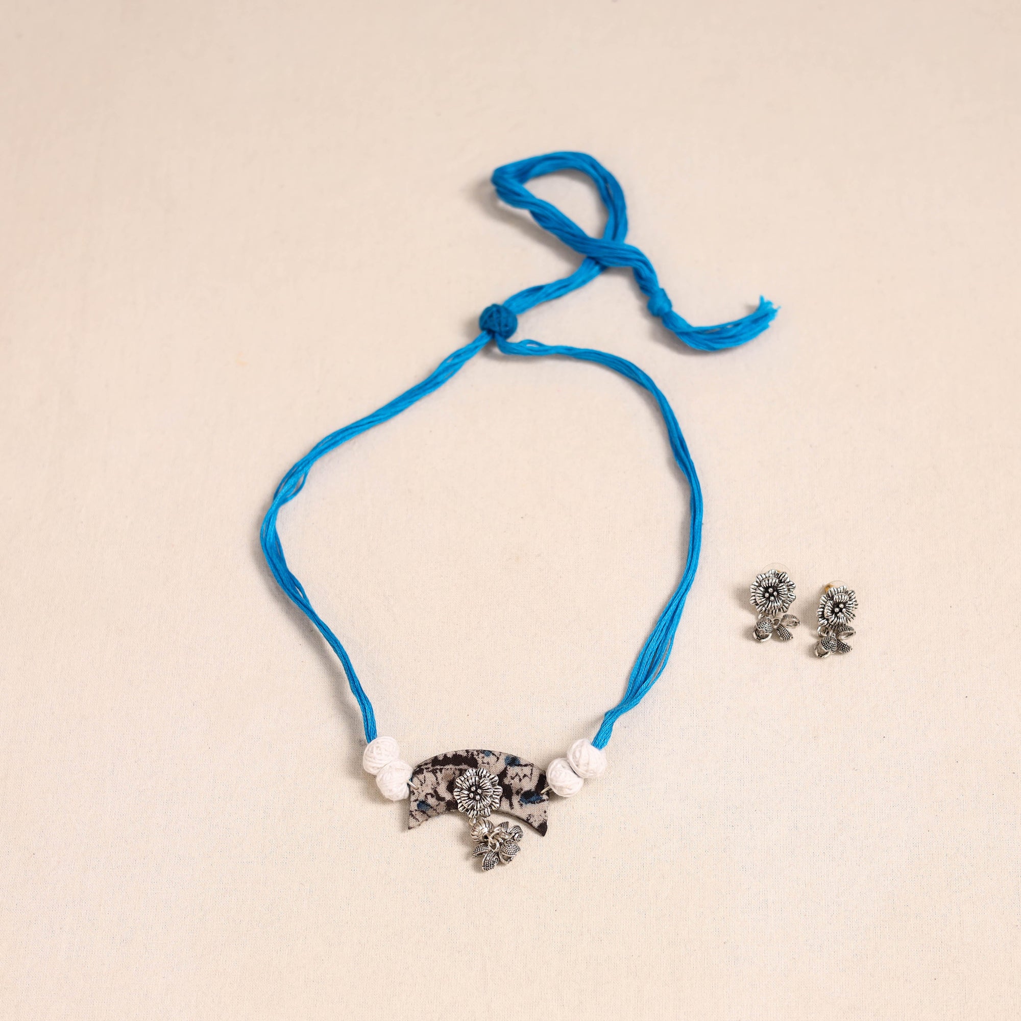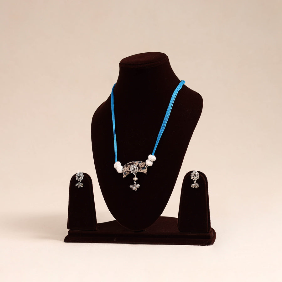 Add a touch of handmade charm to your look with this blue fabart necklace set, adorned with thread beads and german silver. Paired with matching earrings, it completes your look effortlessly. Handcrafted by skilled artisans, this set is ideal for festive occasions, cultural gatherings, or simply to add a unique flair to your everyday style.
