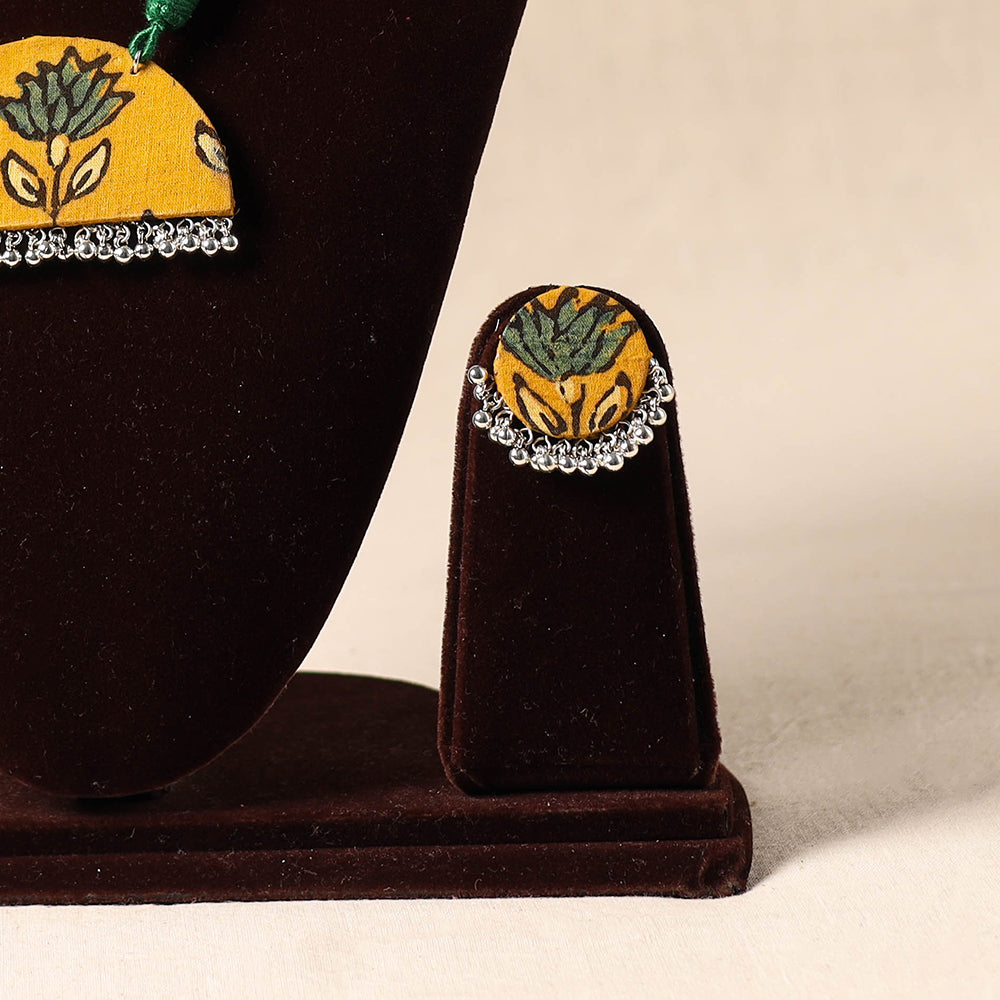Add a touch of handmade charm with this yellow necklace set, crafted from thread and adorned with a fabric pendant accented in german silver. It comes with matching earrings to complete your look. Lightweight and artisan-made, it pairs effortlessly with traditional outfits. Ideal for festive gatherings, cultural functions, or simply to bring a unique touch to your everyday style.