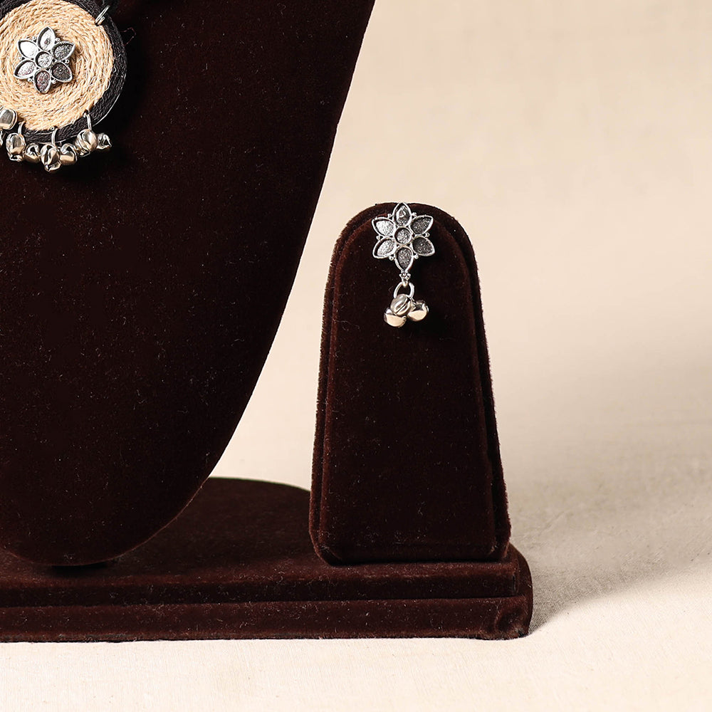 Add a touch of handmade charm with this black necklace set, made from thread and featuring a fabric pendant with german silver. The set also includes matching earrings to complete your look. Crafted by skilled artisans, it’s lightweight and pairs effortlessly with traditional outfits. Perfect for festive occasions, cultural functions, or simply for adding a unique flair to your everyday look.