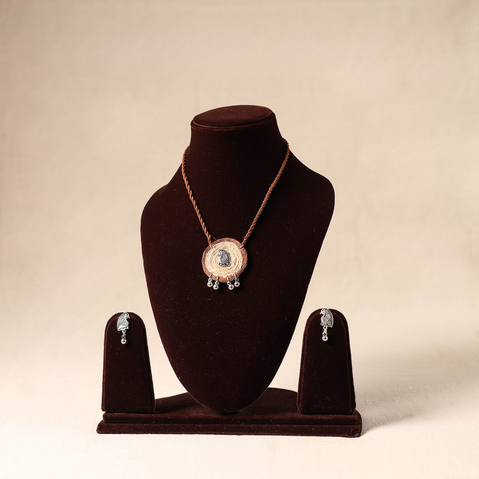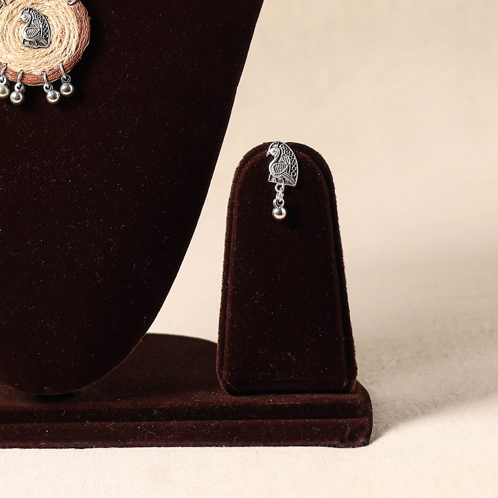 Add a touch of handmade charm with this brown necklace set, made from thread and featuring a fabric pendant with german silver. The set also includes matching earrings to complete your look. Crafted by skilled artisans, it’s lightweight and pairs effortlessly with traditional outfits. Perfect for festive occasions, cultural functions, or simply for adding a unique flair to your everyday look.