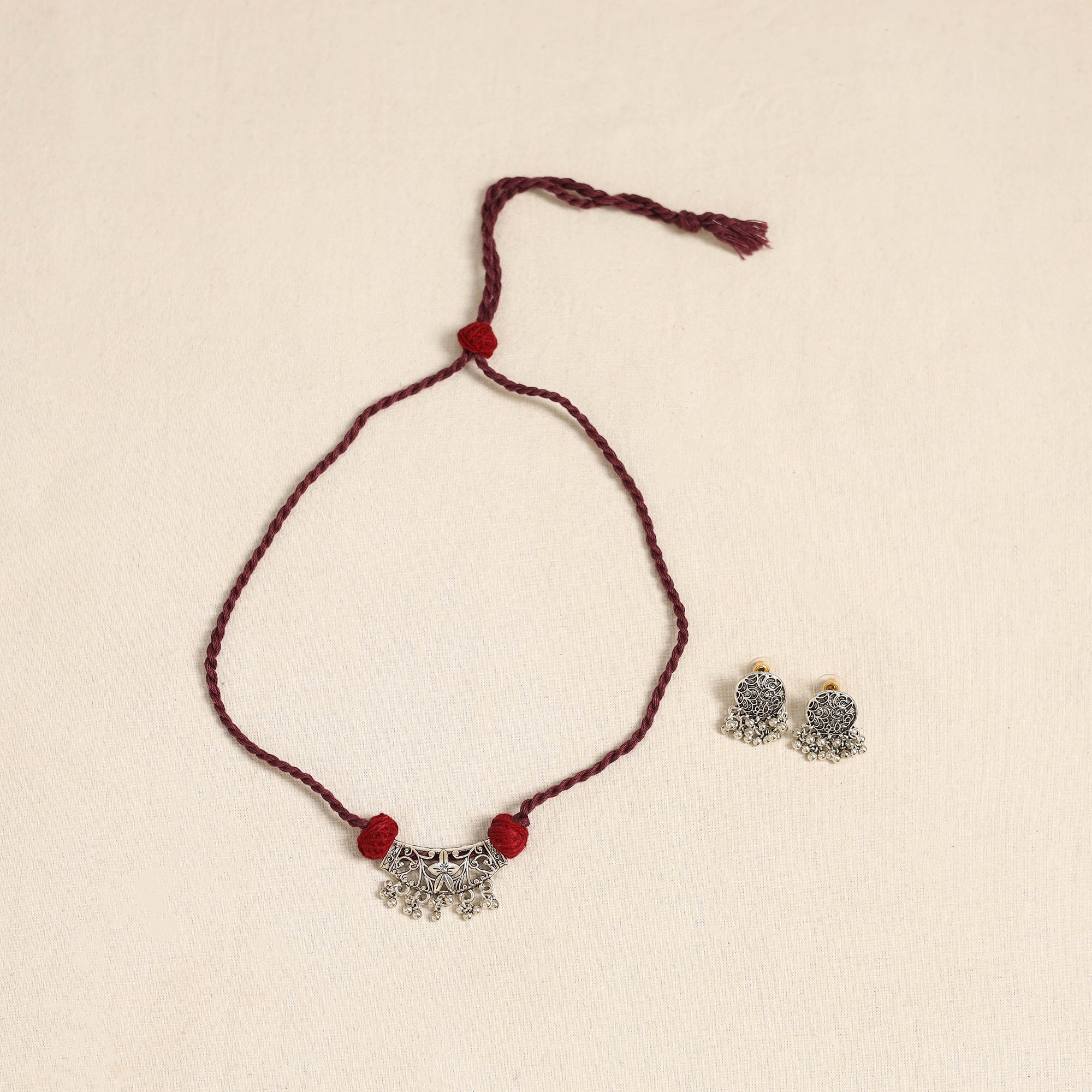 Elevate your ethnic look with this handcrafted maroon necklace set featuring a german silver pendant known for its durability and antique finish. Paired with matching earrings, it’s perfect for festive occasions, cultural events, or adding a distinctive charm to everyday outfits.