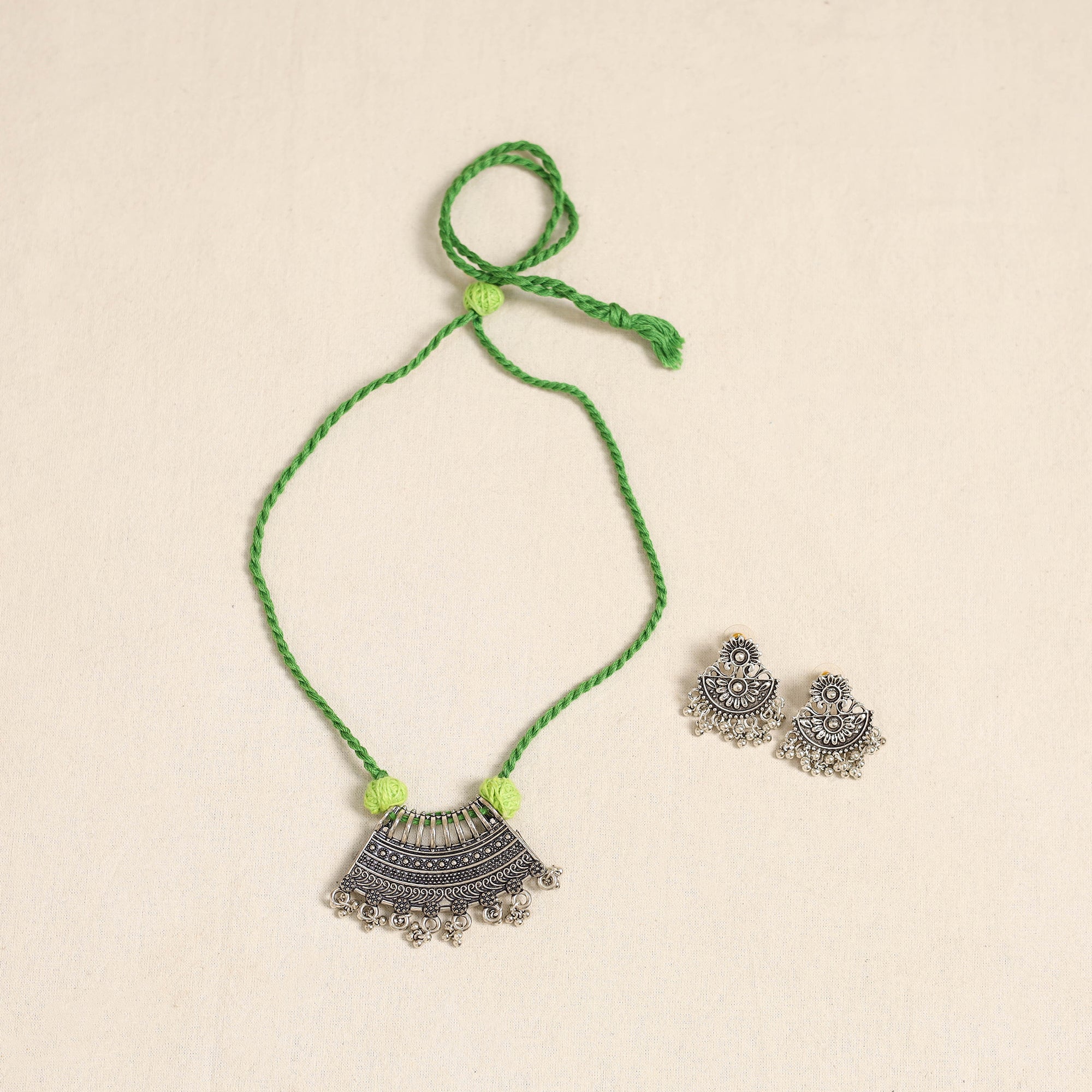 Elevate your ethnic look with this handcrafted green necklace set featuring a german silver pendant known for its durability and antique finish. Paired with matching earrings, it’s perfect for festive occasions, cultural events, or adding a distinctive charm to everyday outfits.