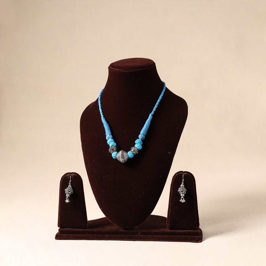 Elevate your ethnic wardrobe with this german silver necklace set, intricately detailed with blue thread-wrapped beads. Paired with matching earrings, this handcrafted set brings a graceful balance of tradition and style. Lightweight and comfortable, it's perfect for festive wear, cultural occasions, or simply making everyday attire feel more special.