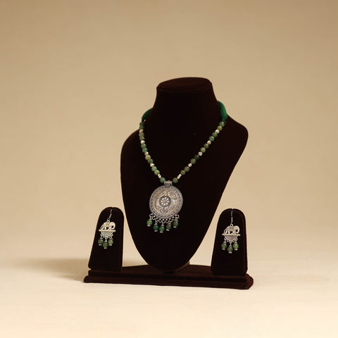 Enhance your style with this green glass stones necklace set featuring a german silver pendant and matching earrings. Perfect for both ethnic and modern outfits. German silver, known for its durability and elegant silvery sheen, elevates the design, making it a true statement accessory.