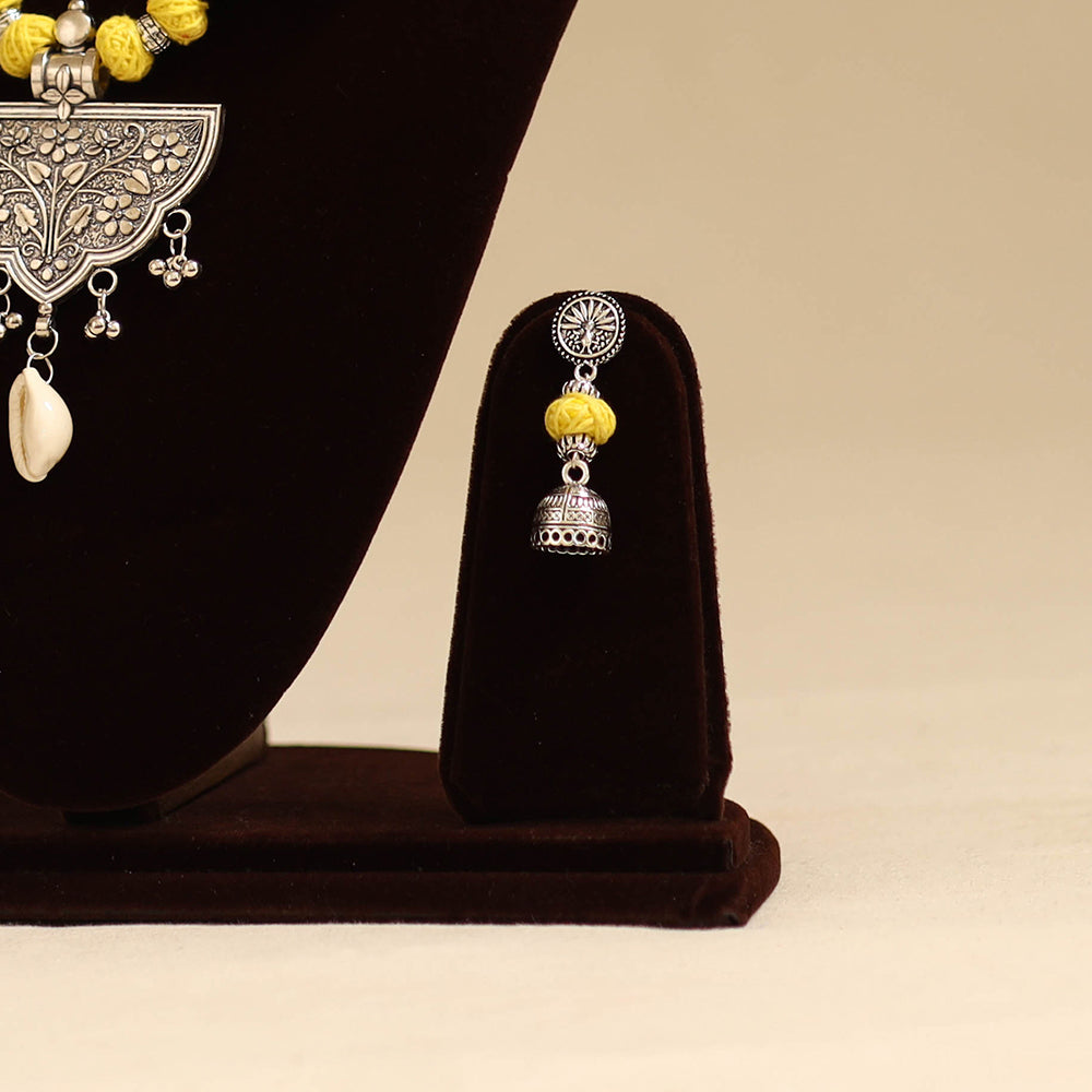 Enhance your style with this yellow thread beads necklace set featuring a german silver pendant and matching earrings. Perfect for both ethnic and modern outfits. German silver, known for its durability and elegant silvery sheen, elevates the design, making it a true statement accessory.
