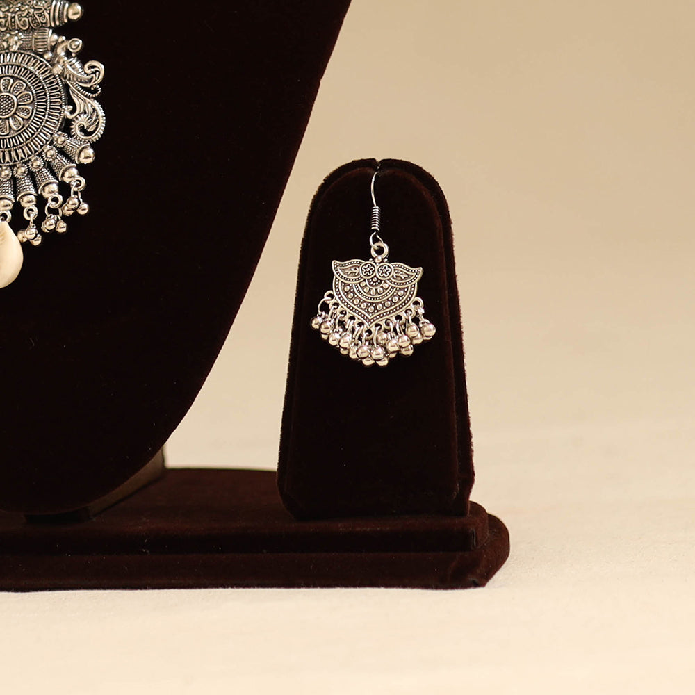 Enhance your style with this green thread beads necklace set featuring a german silver pendant and matching earrings. Perfect for both ethnic and modern outfits. German silver, known for its durability and elegant silvery sheen, elevates the design, making it a true statement accessory.
