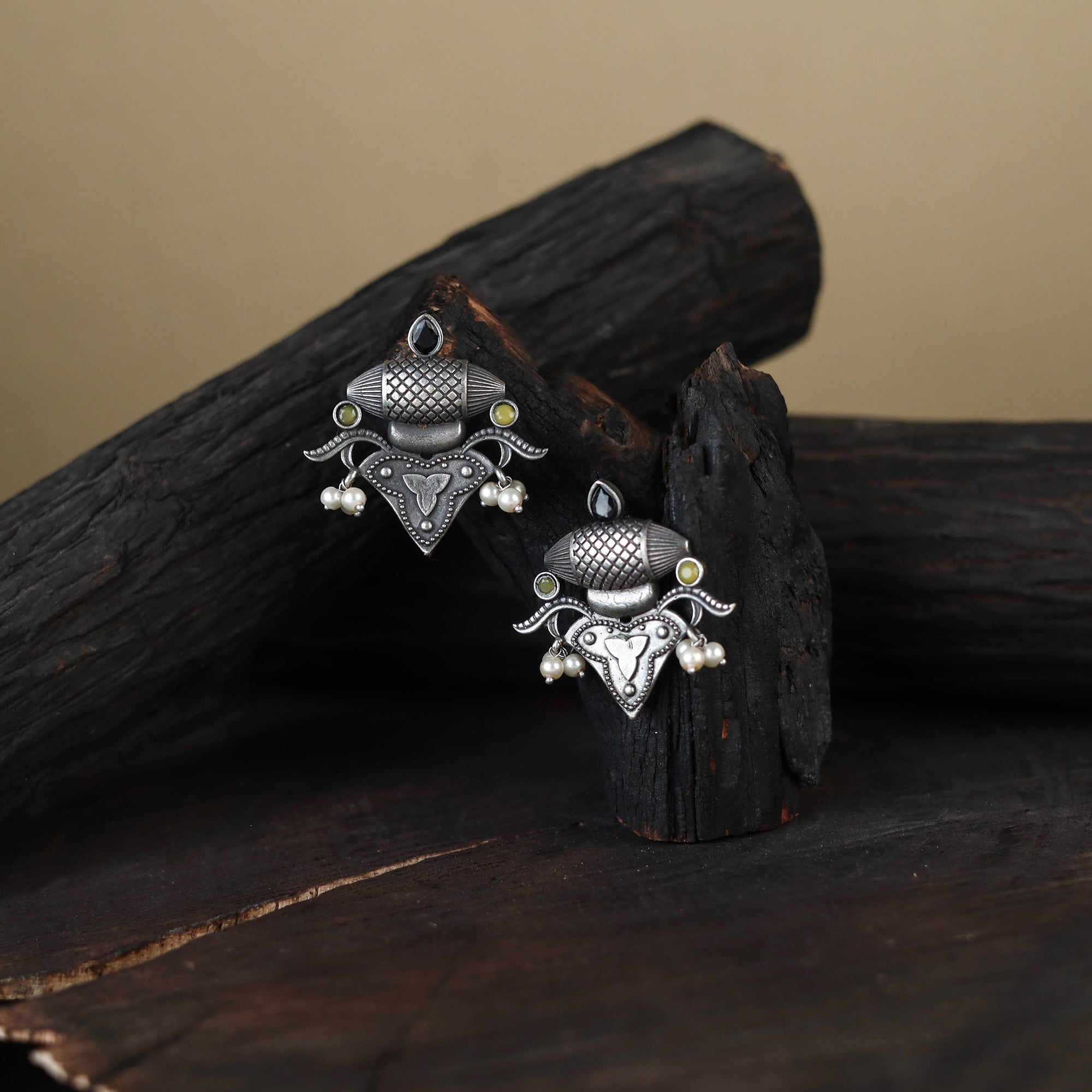 This white german silver-plated handcrafted earrings feature a timeless blend of oxidised metal, pearls, stones, and fine detailing. Elegant in silver tones, they effortlessly complement ethnic outfits as well as casual western looks, making them eye-catching, versatile, and perfect for festivals, weddings, or special occasions. A thoughtful gift for your loved ones, adding a graceful touch of tradition to every celebration.