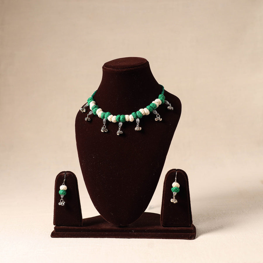 Add a touch of handmade charm with this green german silver necklace set, adorned with delicate thread beads. The set includes matching earrings to complete your look. Handcrafted by skilled artisans, it is lightweight and pairs beautifully with traditional attire. Ideal for festive gatherings, cultural functions, or simply to add a distinctive flair to your everyday look.