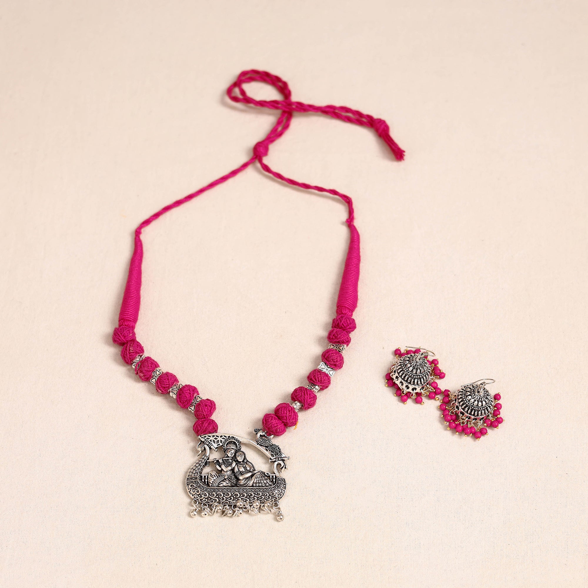 Add a touch of handmade charm to your look with this pink german silver necklace set, adorned with thread beads. Known for its antique finish and durability, German silver lends the set a graceful and lasting appeal. It comes with matching earrings for a complete look. Handcrafted by skilled artisans, this set is perfect for festive occasions, cultural functions, or simply adding a unique flair to your everyday style.