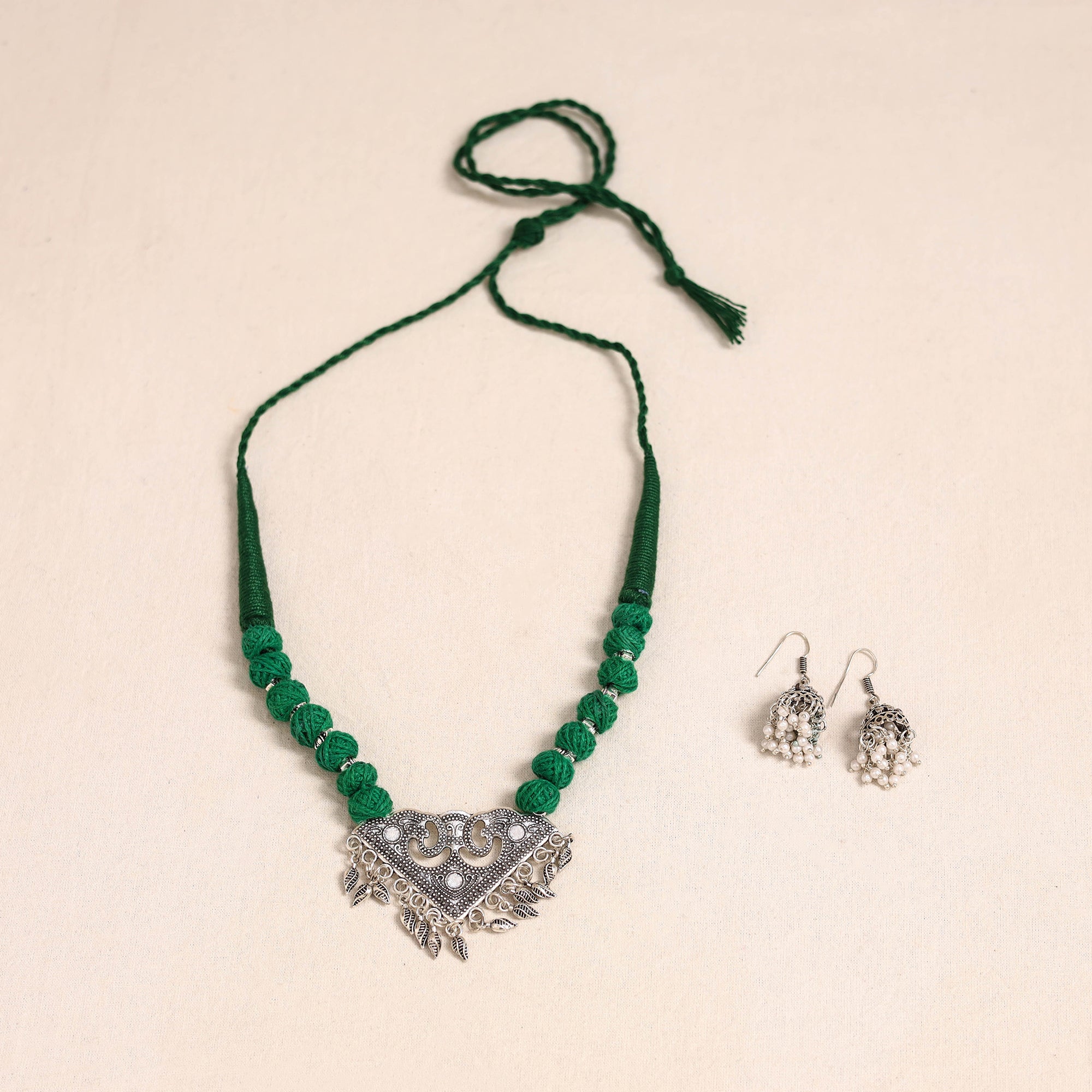Add a touch of handmade charm to your look with this green german silver necklace set, adorned with thread beads. Known for its antique finish and durability, German silver lends the set a graceful and lasting appeal. It comes with matching earrings for a complete look. Handcrafted by skilled artisans, this set is perfect for festive occasions, cultural functions, or simply adding a unique flair to your everyday style.