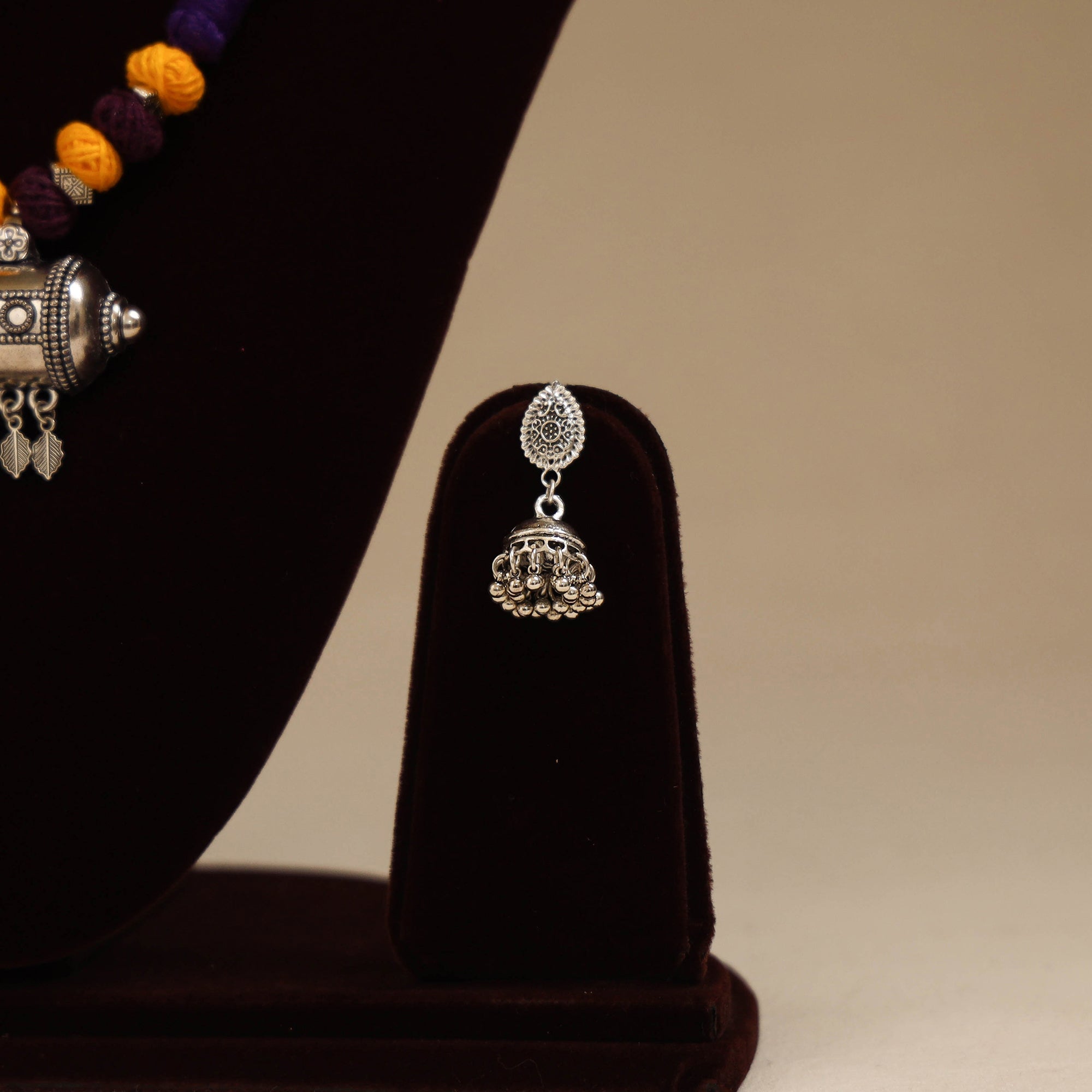 Handmade purple german silver necklace set with thread beads. Known for its antique finish and durability. It comes with matching earrings for a complete look. Created by artisans this set is perfect for cultural functions or simply adding a unique flair to your everyday style.