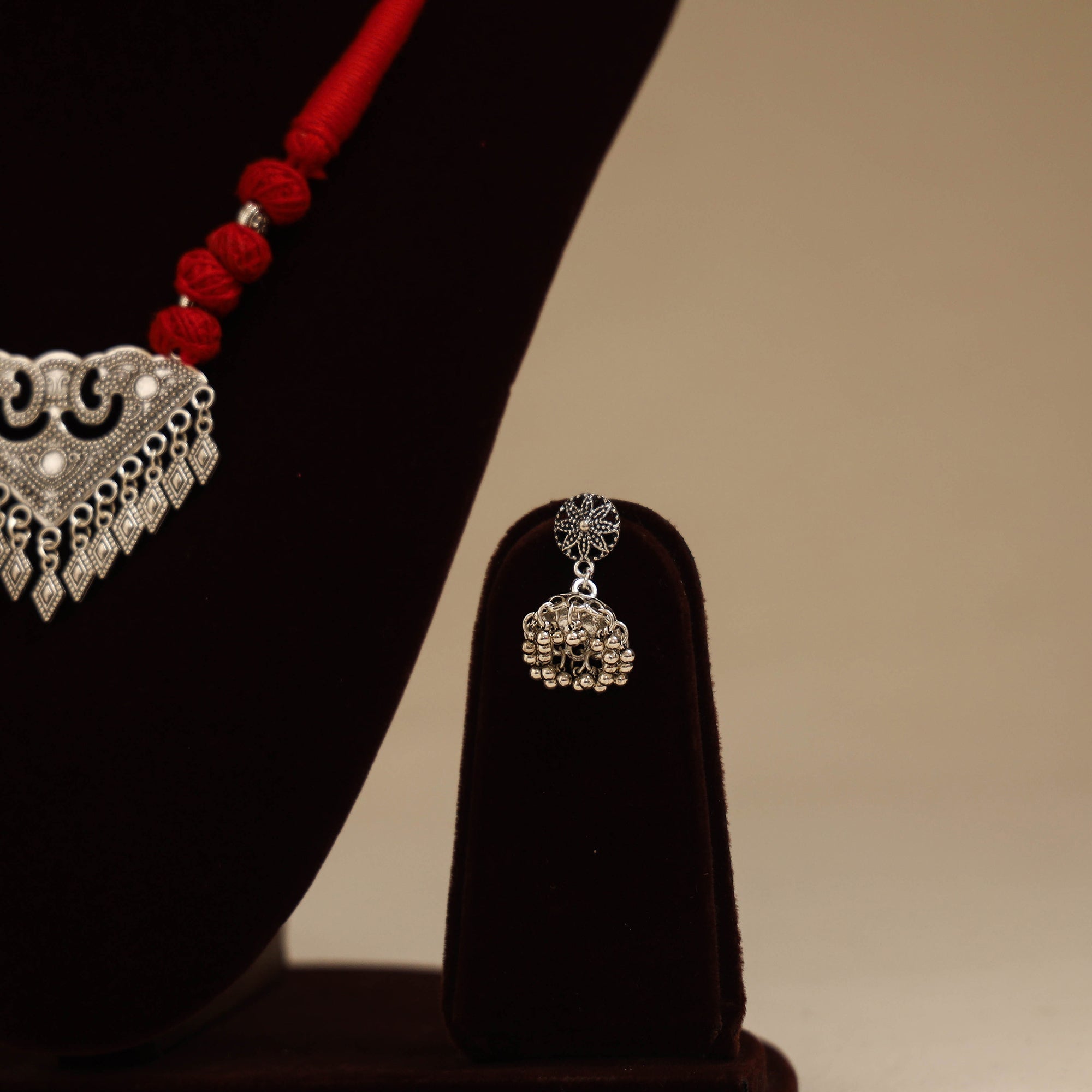 Handmade red german silver necklace set with thread beads. Known for its antique finish and durability. It comes with matching earrings for a complete look. Created by artisans this set is perfect for cultural functions or simply adding a unique flair to your everyday style.