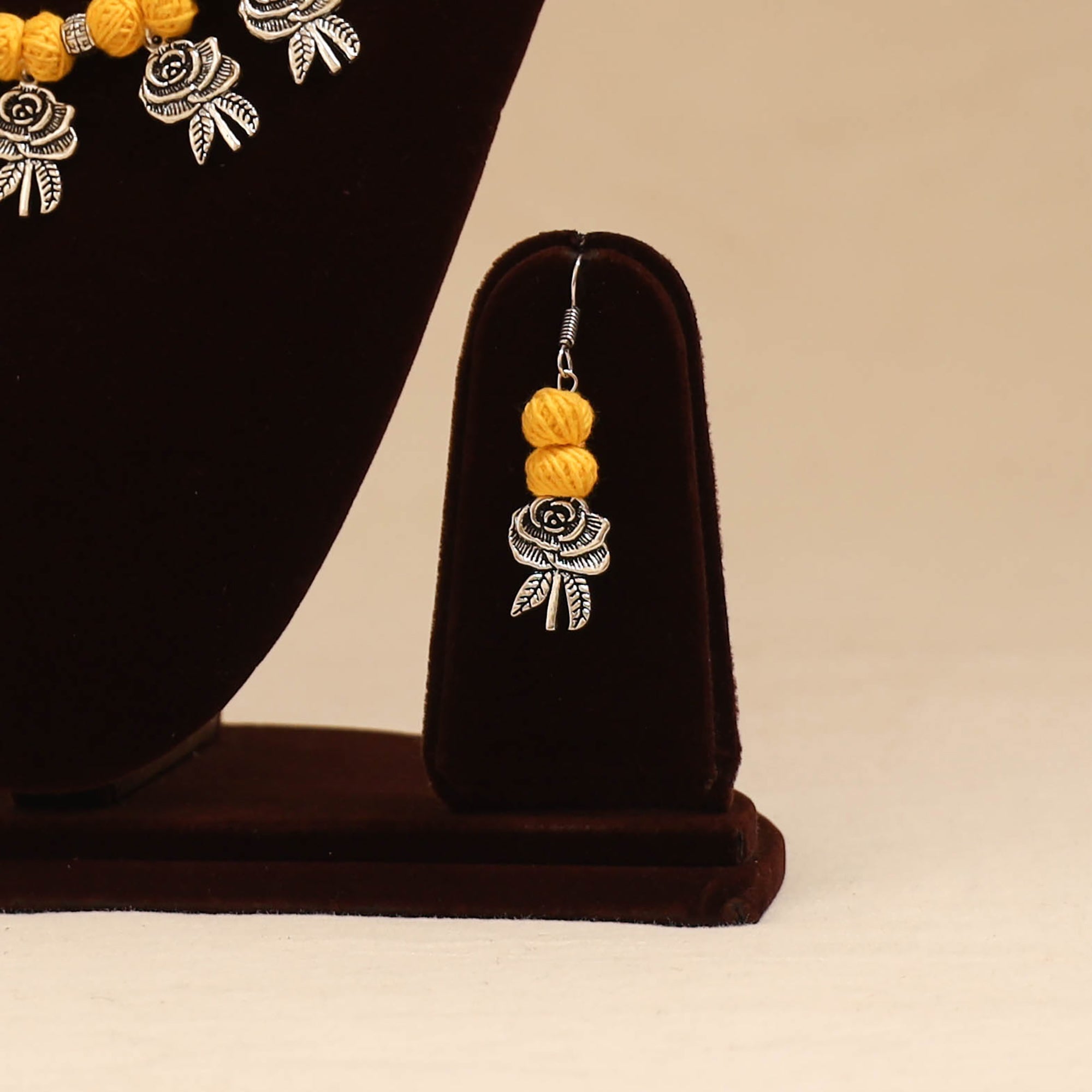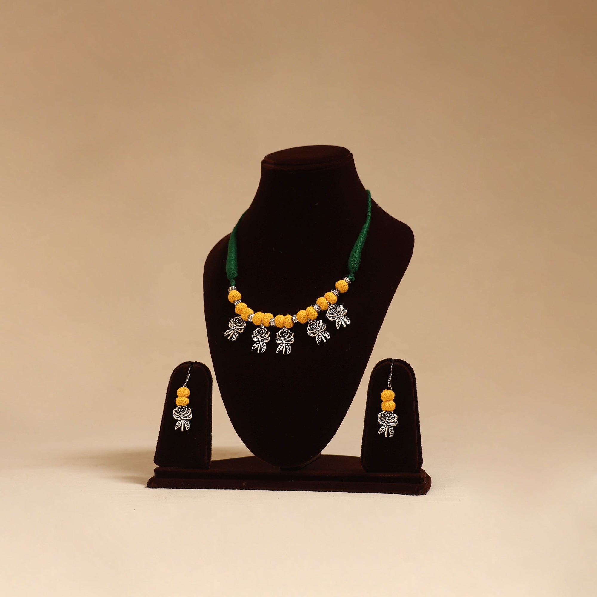 Add a touch of handmade charm to your look with this german silver necklace set adorned with yellow thread beads. Known for its antique finish and durability, German silver gives the set a refined touch. It comes with matching earrings for a complete look. Created by skilled artisans, this set is perfect for festive occasions, cultural functions or simply adding a unique flair to your everyday style.