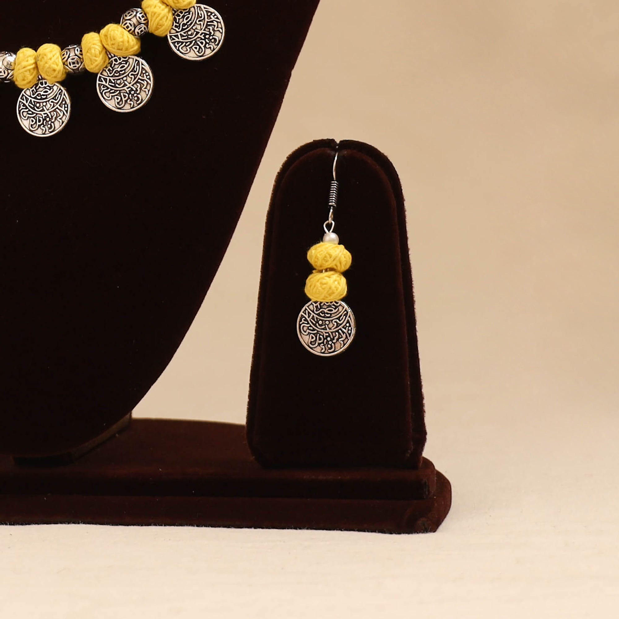 Add a touch of handmade charm to your look with this german silver necklace set adorned with yellow thread beads. Known for its antique finish and durability, German silver gives the set a refined touch. It comes with matching earrings for a complete look. Created by skilled artisans, this set is perfect for festive occasions, cultural functions or simply adding a unique flair to your everyday style.