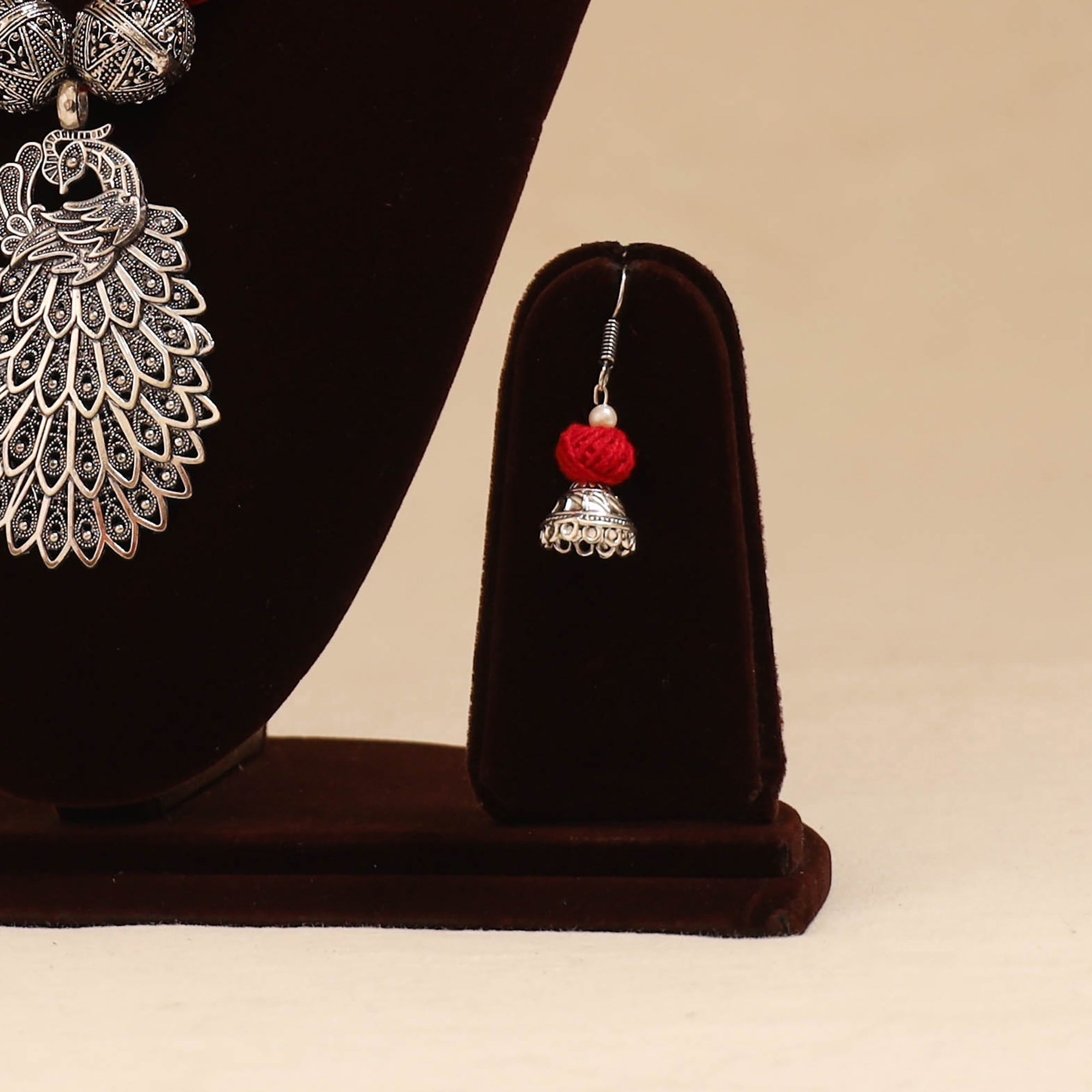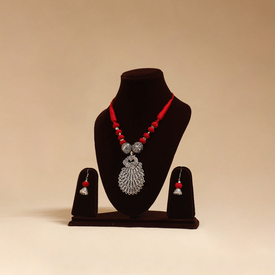 Add a touch of handmade charm to your look with this german silver necklace set adorned with red thread beads. Known for its antique finish and durability, German silver gives the set a refined touch. It comes with matching earrings for a complete look. Created by skilled artisans, this set is perfect for festive occasions, cultural functions or simply adding a unique flair to your everyday style.