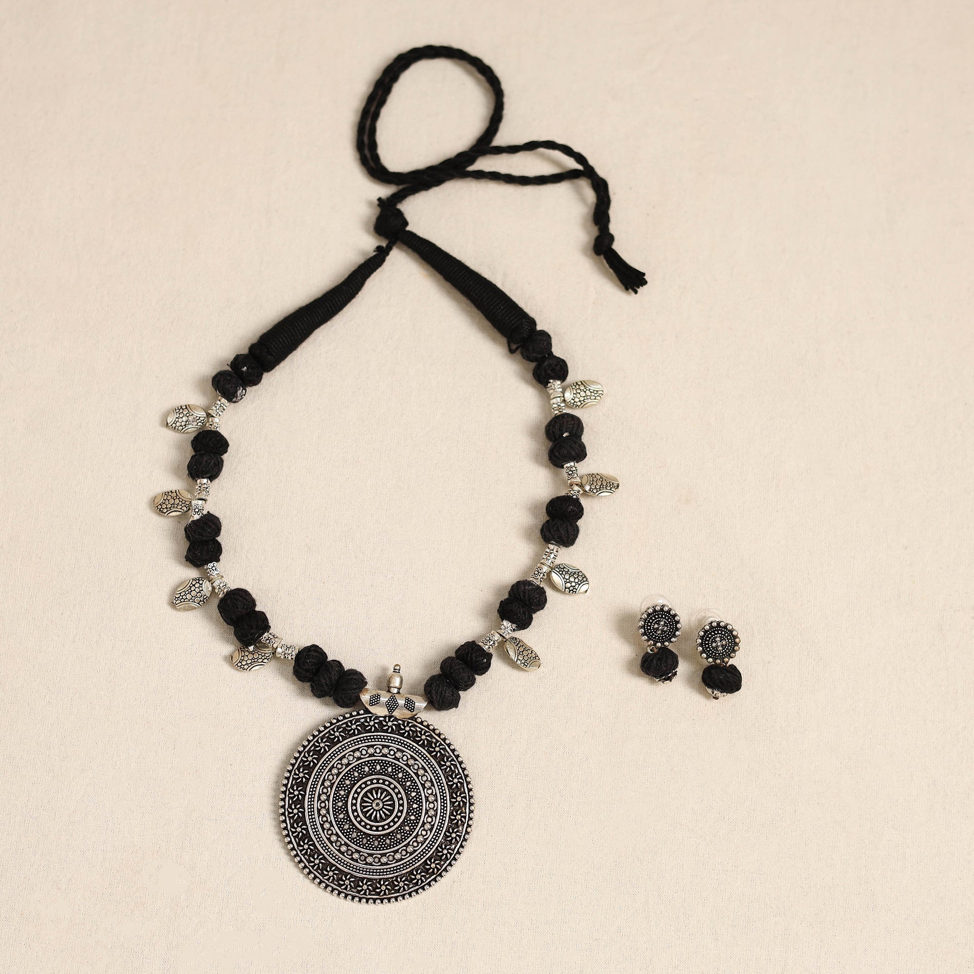 Elevate your ethnic look with this handcrafted black necklace set, featuring a german silver pendant known for its durability and antique finish. Thread beads make the necklace look more vibrant. Paired with matching earrings, it’s perfect for festive occasions, cultural events, or adding a distinctive charm to your everyday outfits.