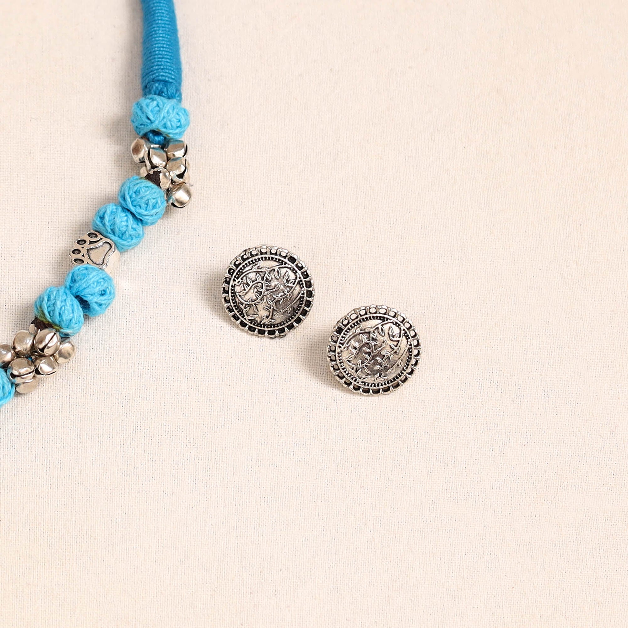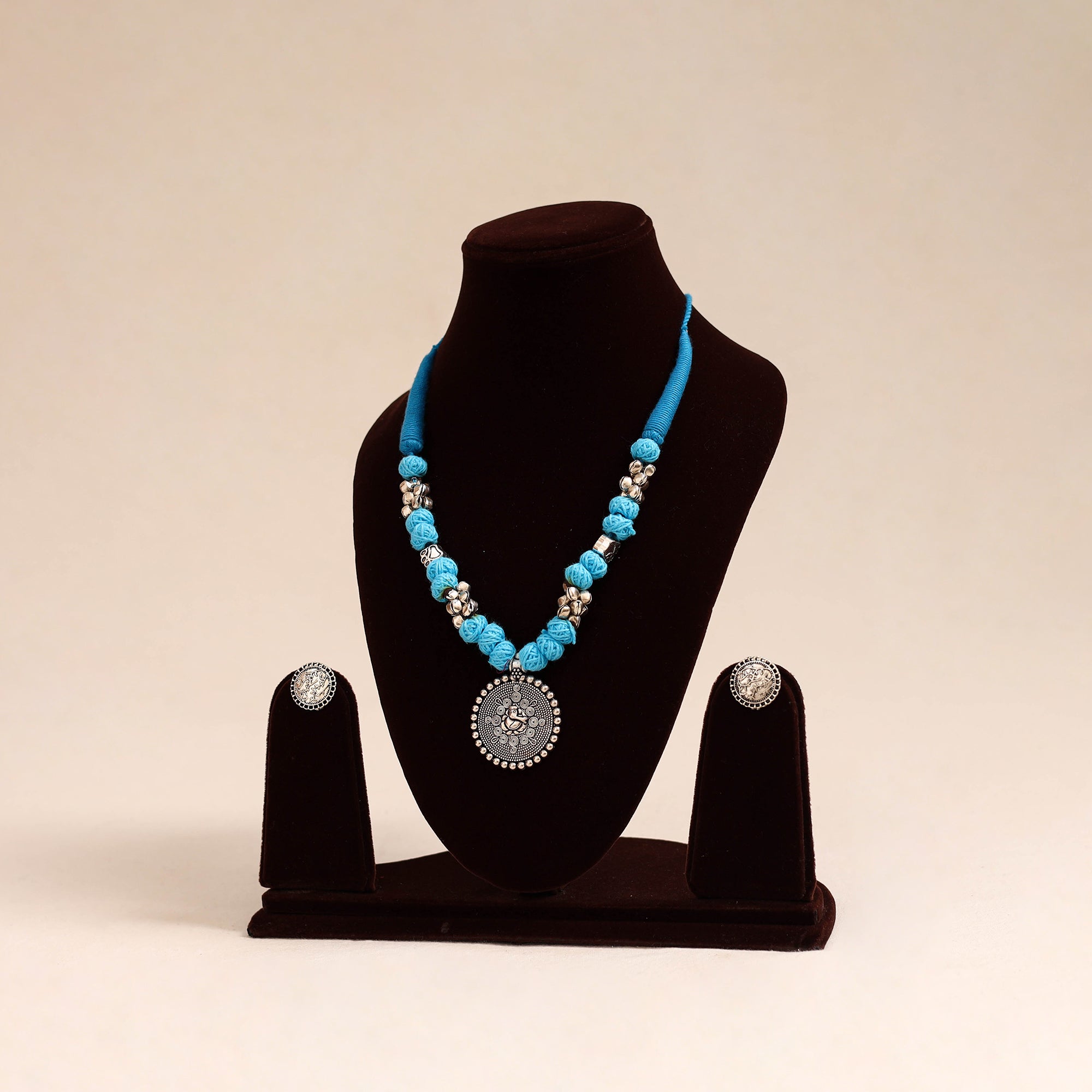 Add a touch of handmade charm to your look with this blue german silver necklace set, adorned with thread beads. Known for its antique finish and durability, German silver lends the set a graceful and lasting appeal. It comes with matching earrings for a complete look. Handcrafted by skilled artisans, this set is perfect for festive occasions, cultural functions, or simply adding a unique flair to your everyday style.