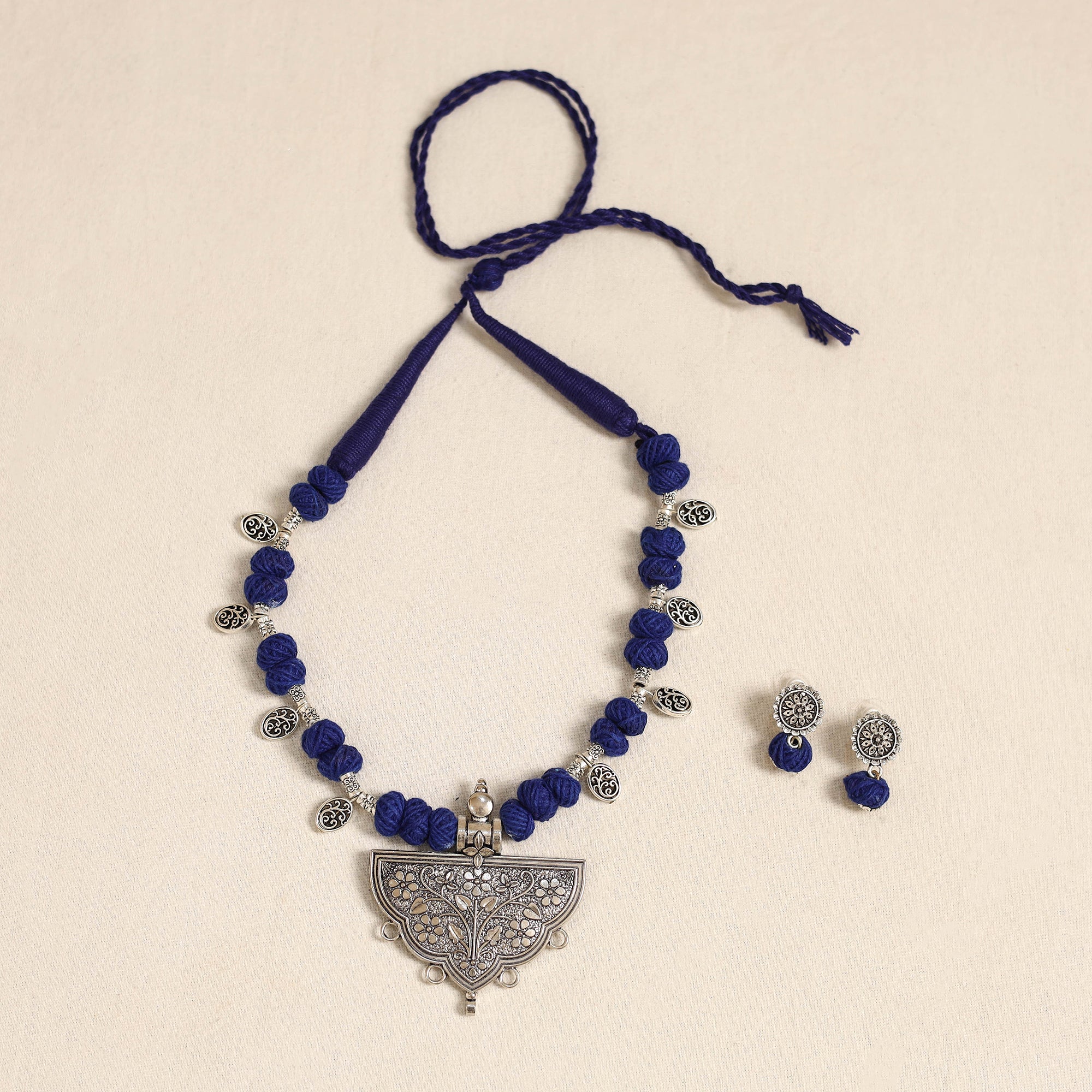 Elevate your ethnic look with this handcrafted blue necklace set, featuring a german silver pendant known for its durability and antique finish. Thread beads make the necklace look more vibrant. Paired with matching earrings, it’s perfect for festive occasions, cultural events, or adding a distinctive charm to your everyday outfits.