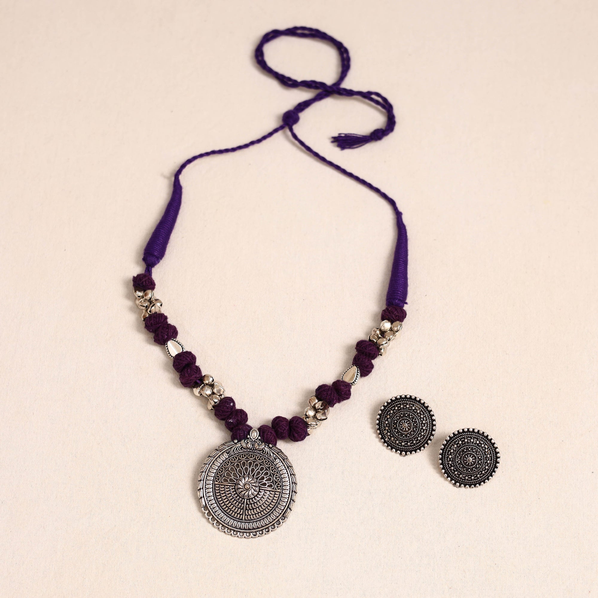 Add a touch of handmade charm to your look with this purple german silver necklace set, adorned with thread beads. Known for its antique finish and durability, German silver lends the set a graceful and lasting appeal. It comes with matching earrings for a complete look. Handcrafted by skilled artisans, this set is perfect for festive occasions, cultural functions, or simply adding a unique flair to your everyday style.