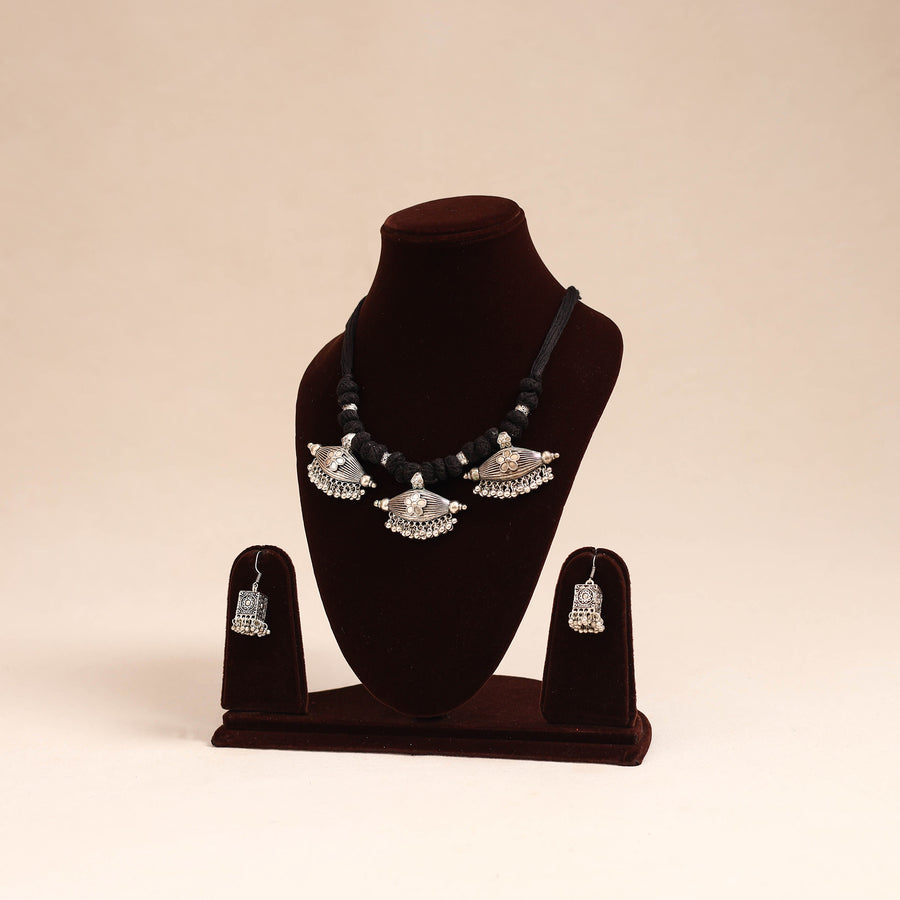 Elevate your ethnic look with this handcrafted black necklace set, featuring a german silver pendant known for its durability and antique finish. Thread beads make the necklace look more vibrant. Paired with matching earrings, it’s perfect for festive occasions, cultural events, or adding a distinctive charm to your everyday outfits.