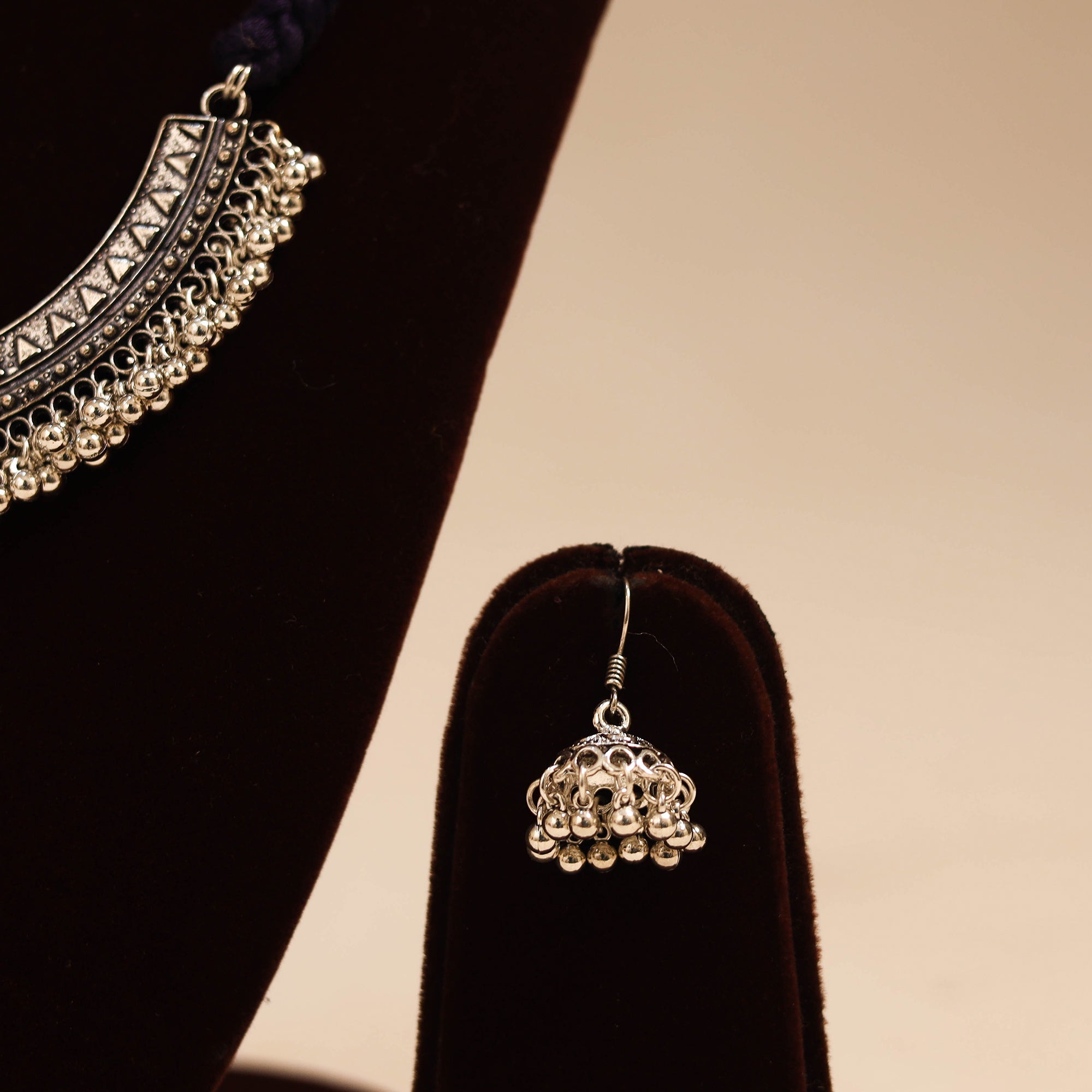 Elevate your ethnic look with this black handcrafted necklace set made from intricately detailed german silver and complemented by matching earrings. Designed on a soft, hand-braided thread, it combines lasting comfort with rustic elegance. Ideal for festive occasions, cultural gatherings, or adding a distinctive charm to your everyday style.