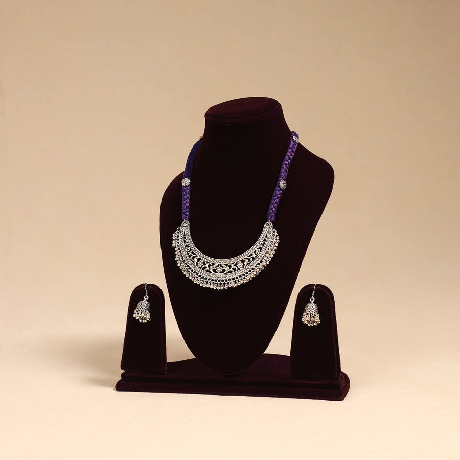 Elevate your ethnic look with this purple handcrafted necklace set made from intricately detailed german silver and complemented by matching earrings. Designed on a soft, hand-braided thread, it combines lasting comfort with rustic elegance. Ideal for festive occasions, cultural gatherings, or adding a distinctive charm to your everyday style.