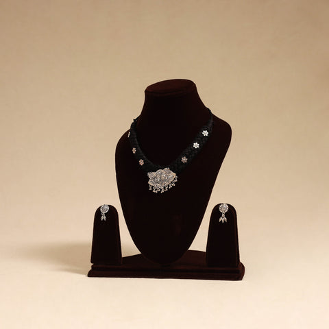 Elevate your ethnic look with this black handcrafted necklace set featuring a beautifully detailed german silver pendant paired with matching earrings. The pendant is strung on a soft, hand-braided thread, blending comfort with rustic elegance. Perfect for festive occasions, cultural gatherings, or simply adding a distinctive charm to your everyday style.