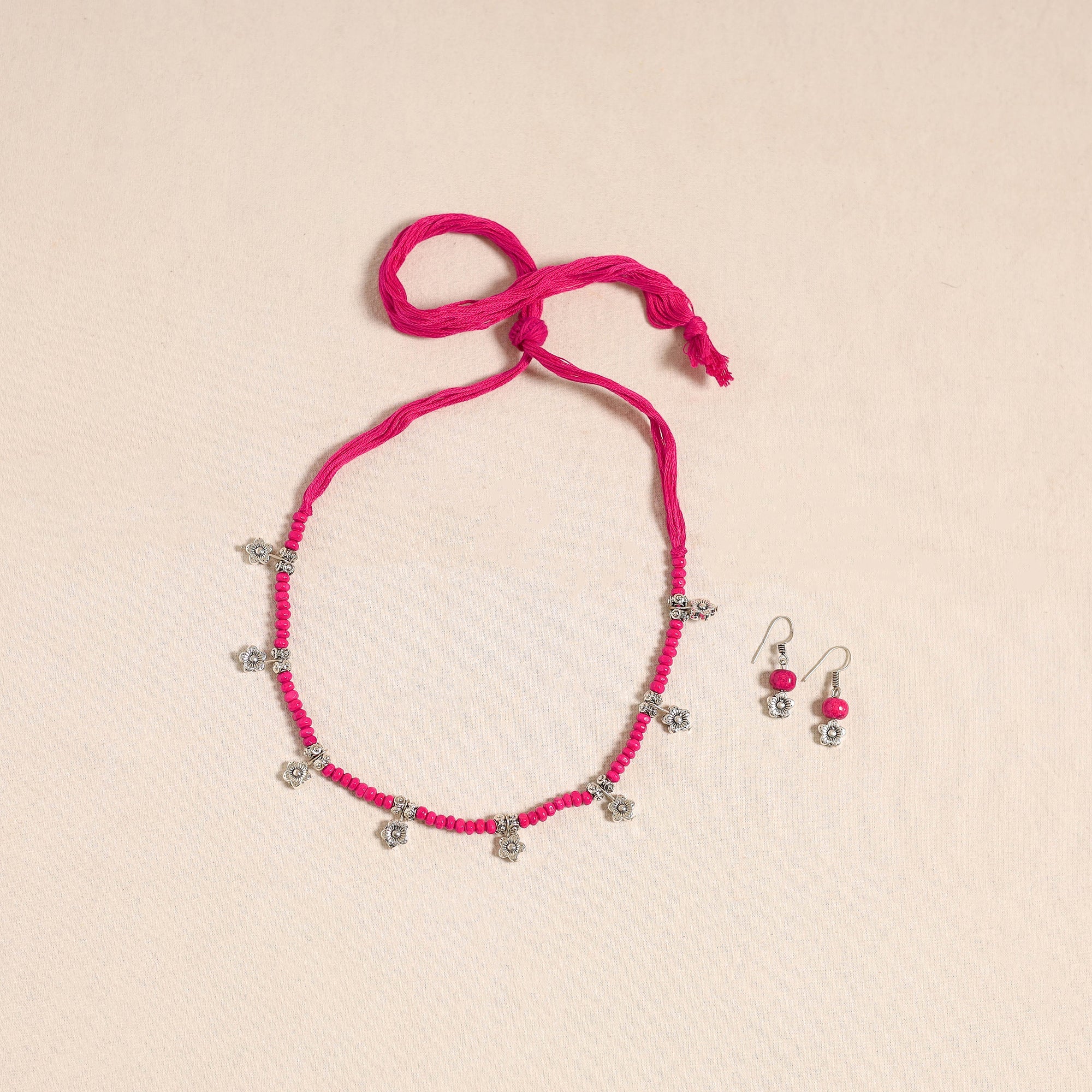 Elevate your ethnic look with this handcrafted pink necklace set, made from german silver and wooden beads. Paired with matching earrings, it’s perfect for festive occasions, cultural events, or adding a distinctive charm to your everyday outfits.