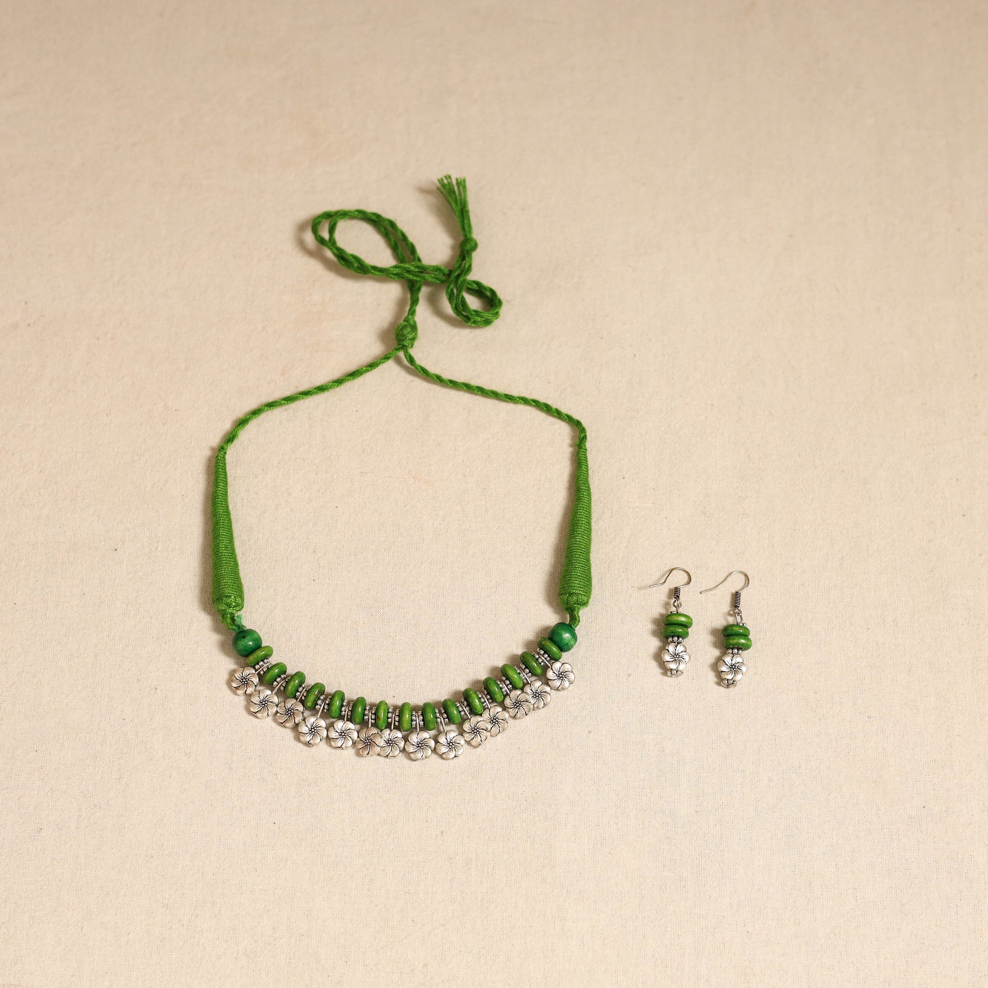 Elevate your ethnic look with this green handcrafted necklace set, made from german silver and wooden beads. Paired with matching earrings, it’s a versatile pick for festive dressing, cultural functions, or simply adding elegance to casual everyday attire.