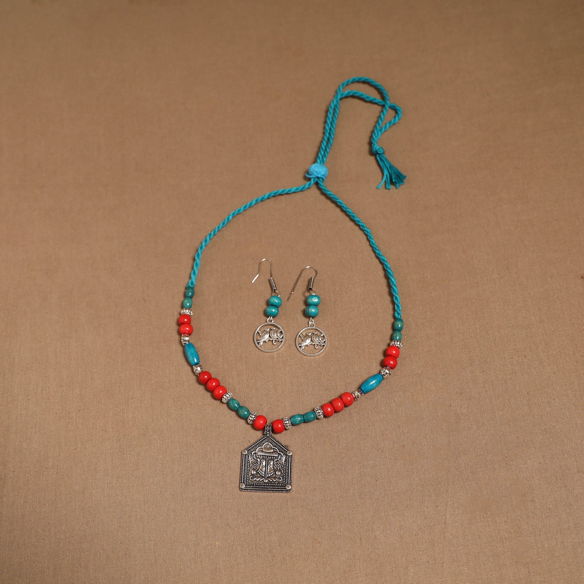 Handmade german silver necklace set with wooden beads. Known for its antique finish and durability. It comes with matching earrings for a complete look. Created by artisans, this set is suitable for weddings, cultural functions or for adding a unique flair to everyday style.