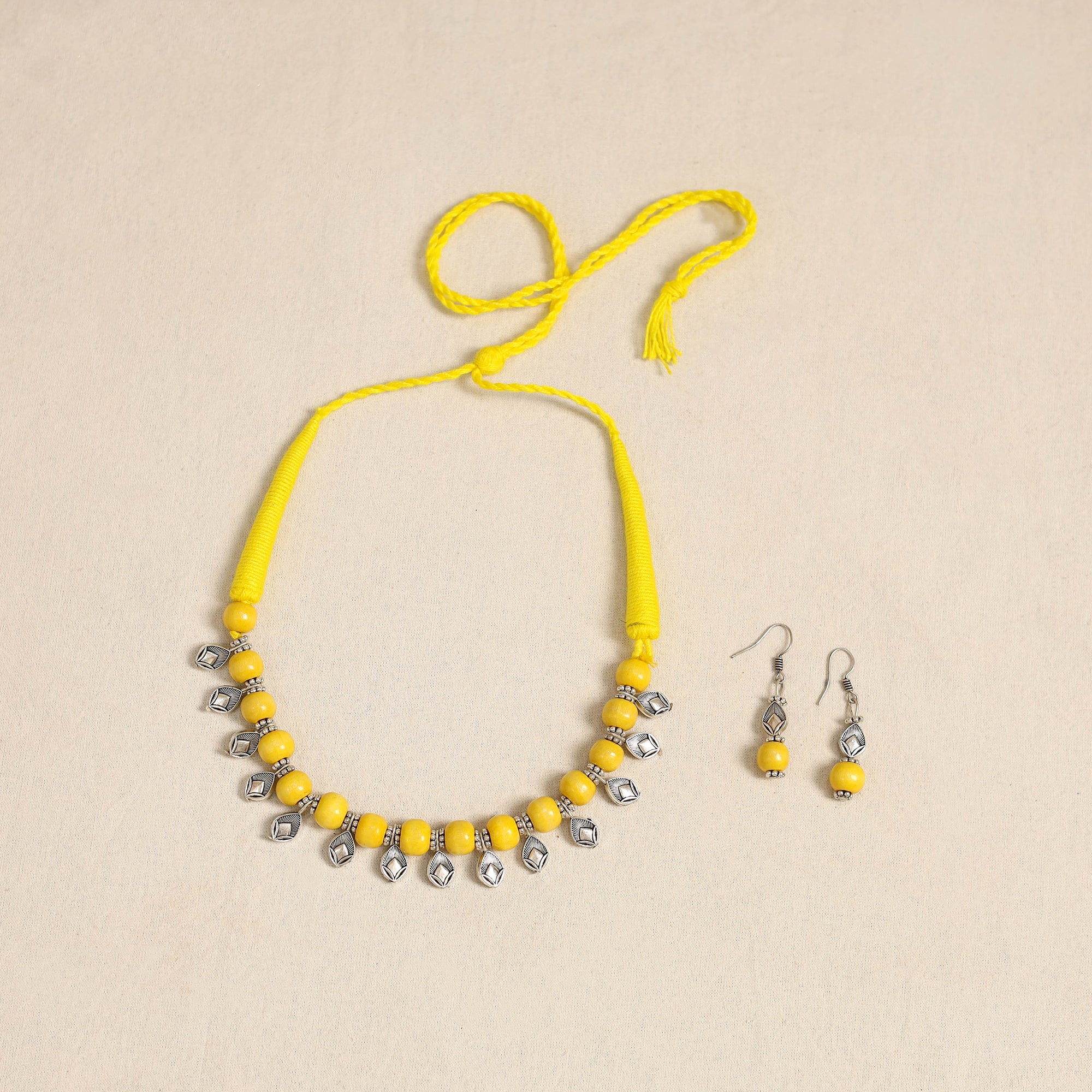 Elevate your ethnic look with this handcrafted yellow necklace set, made from german silver and wooden beads. Paired with matching earrings, it’s perfect for festive occasions, cultural events, or adding a distinctive charm to your everyday outfits.