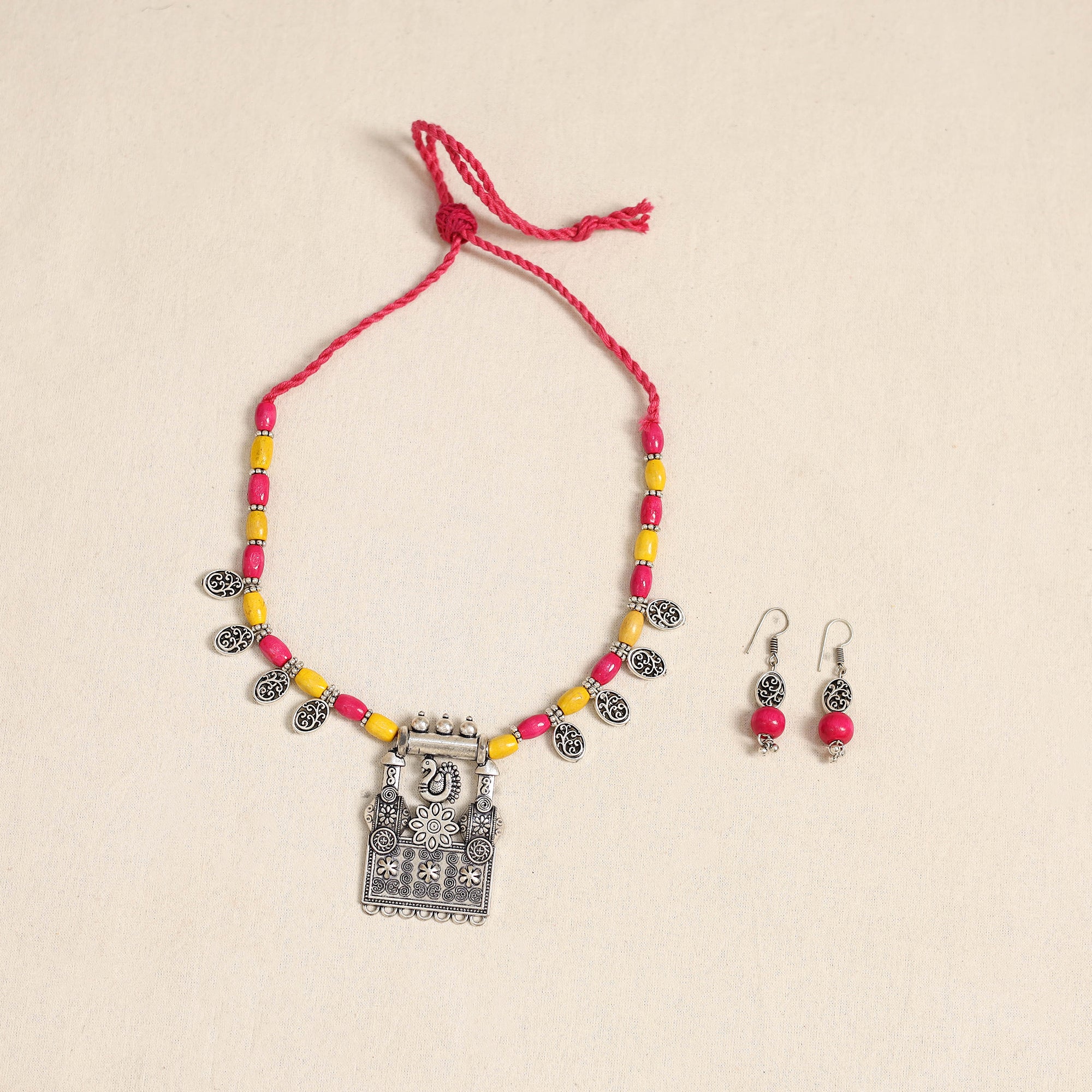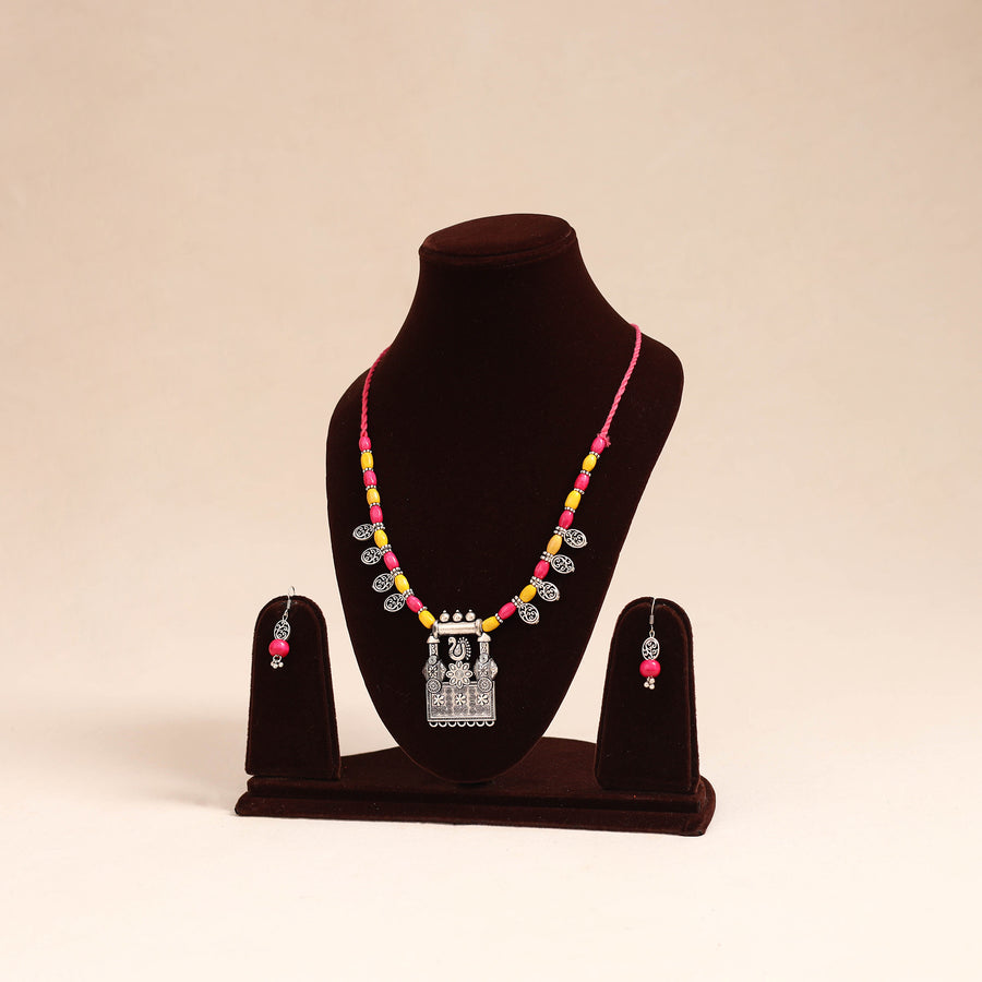 Elevate your ethnic look with this handcrafted pink necklace set, featuring a german silver pendant known for its durability and antique finish. Wooden beads make the necklace look more vibrant. Paired with matching earrings, it’s perfect for festive occasions, cultural events, or adding a distinctive charm to your everyday outfits.