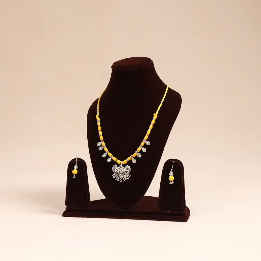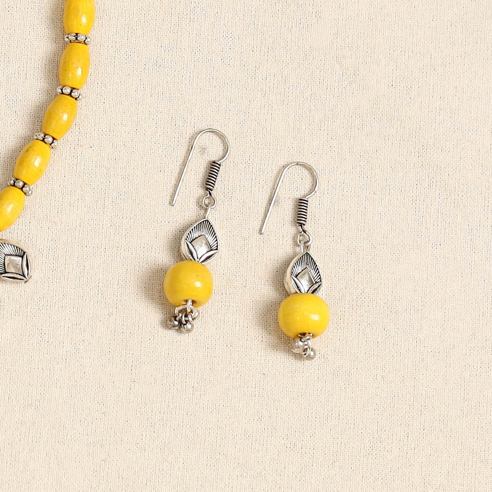 Elevate your ethnic look with this handcrafted yellow necklace set, featuring a german silver pendant known for its durability and antique finish. Wooden beads make the necklace look more vibrant. Paired with matching earrings, it’s perfect for festive occasions, cultural events, or adding a distinctive charm to your everyday outfits.