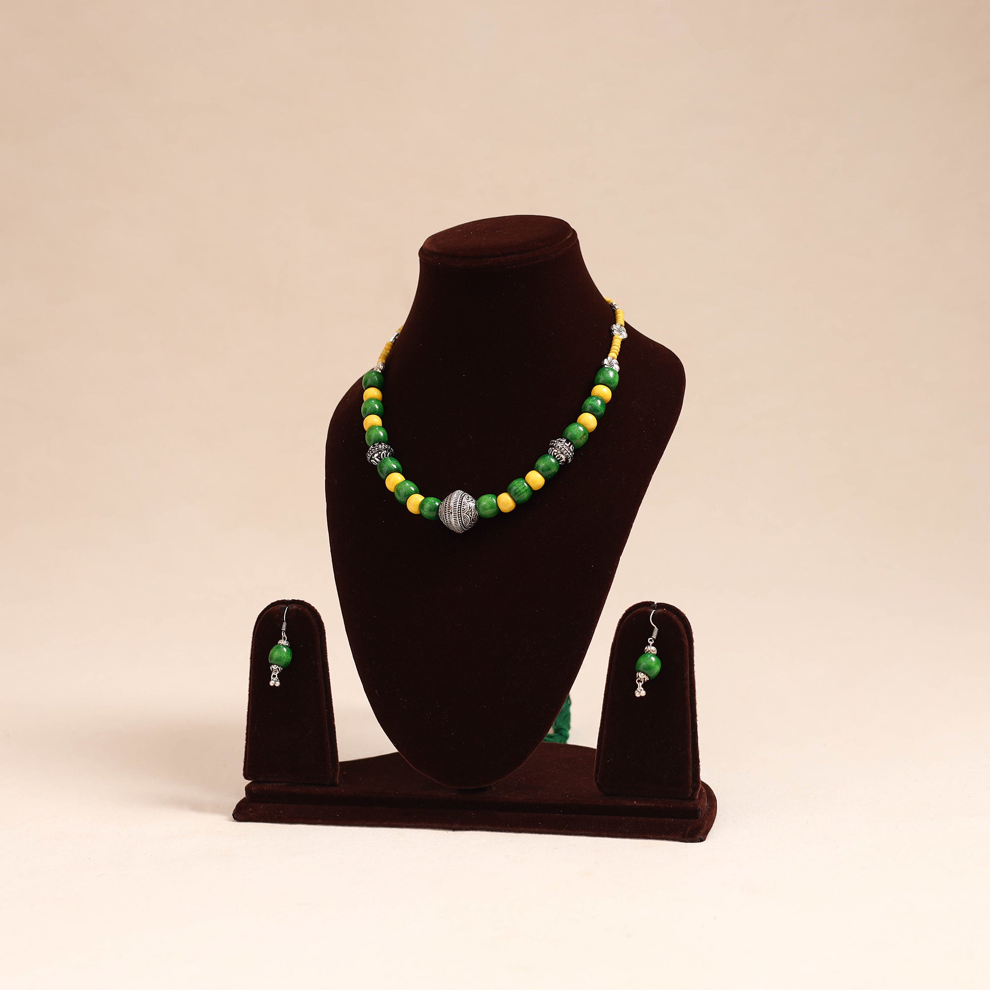 Elevate your ethnic look with this handcrafted green necklace set, made from german silver and wooden beads. Paired with matching earrings, it’s perfect for festive occasions, cultural events, or adding a distinctive charm to your everyday outfits.