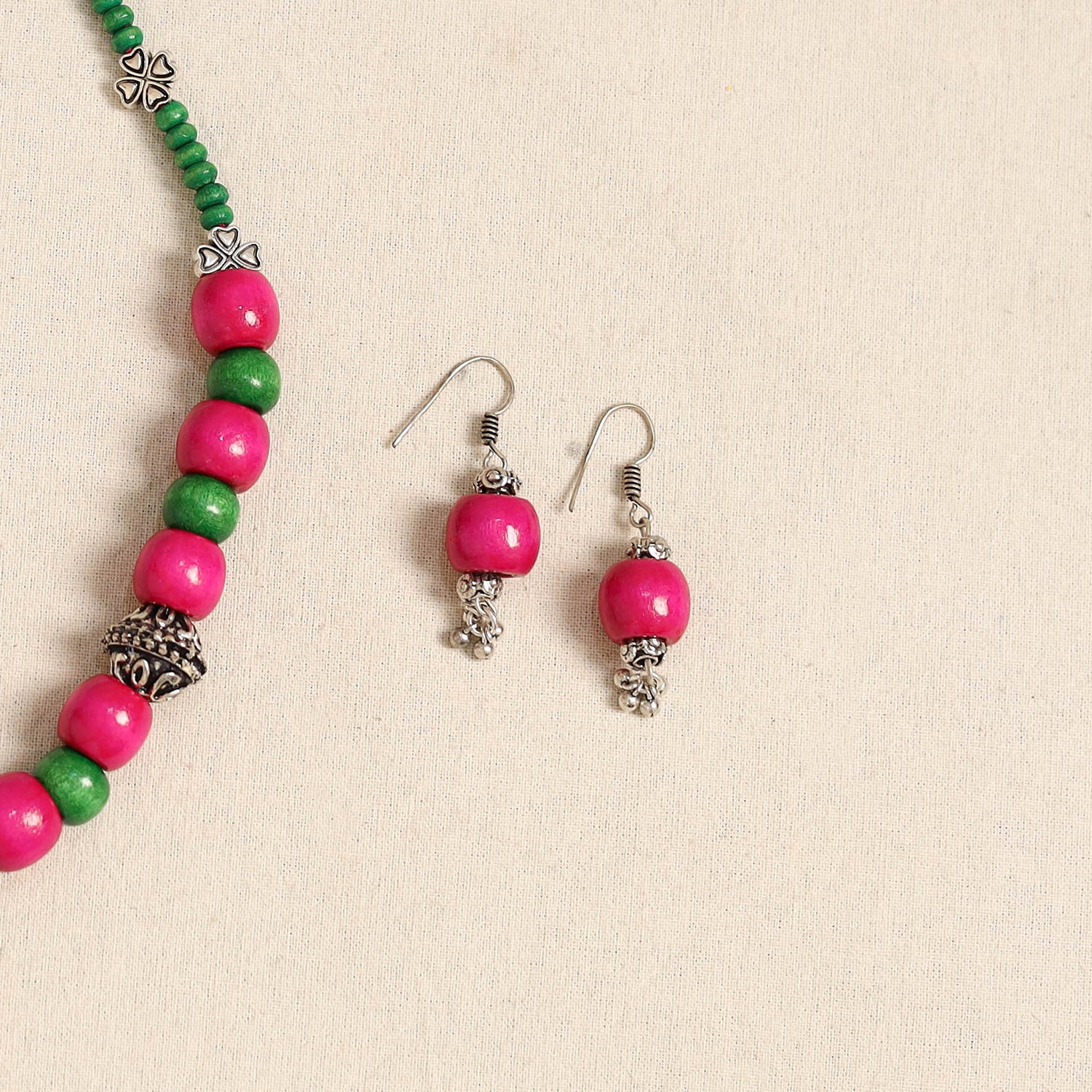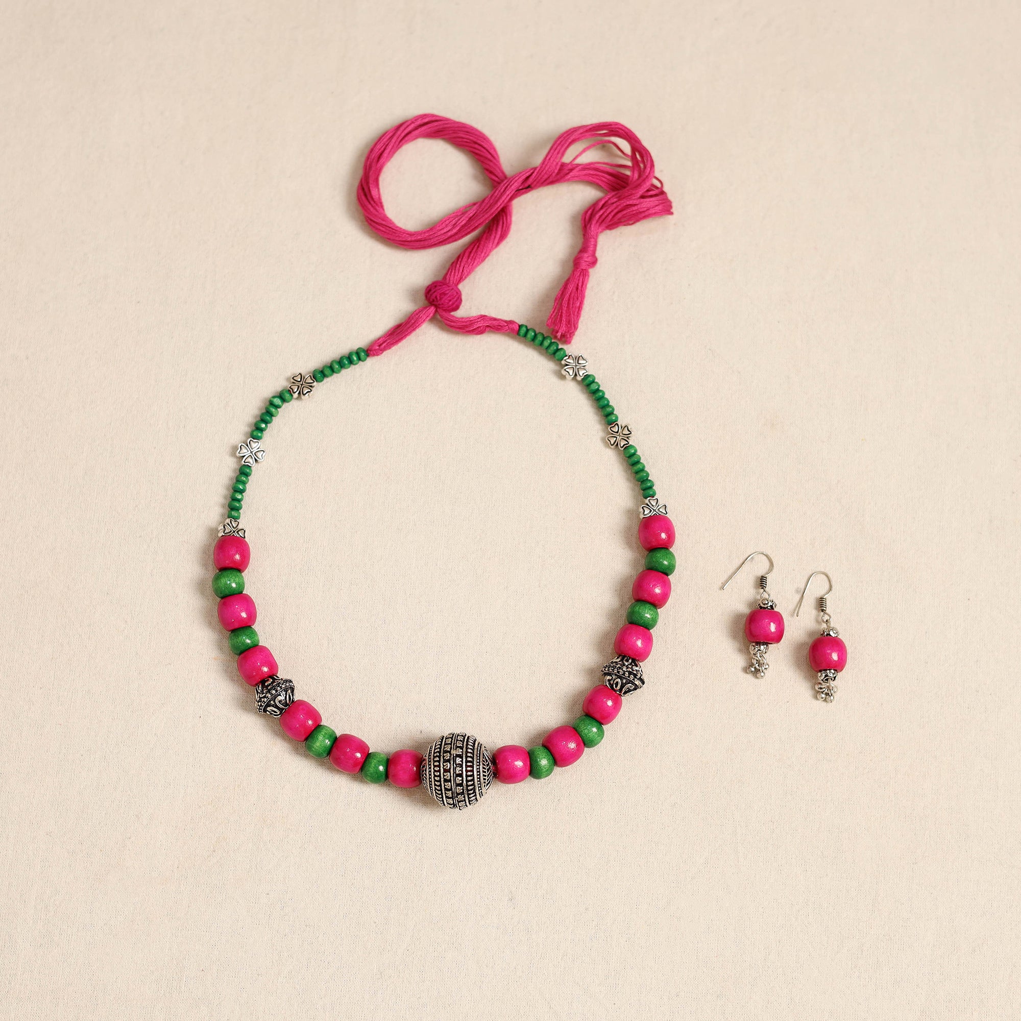 Elevate your ethnic look with this handcrafted pink necklace set, made from german silver and wooden beads. Paired with matching earrings, it’s perfect for festive occasions, cultural events, or adding a distinctive charm to your everyday outfits.