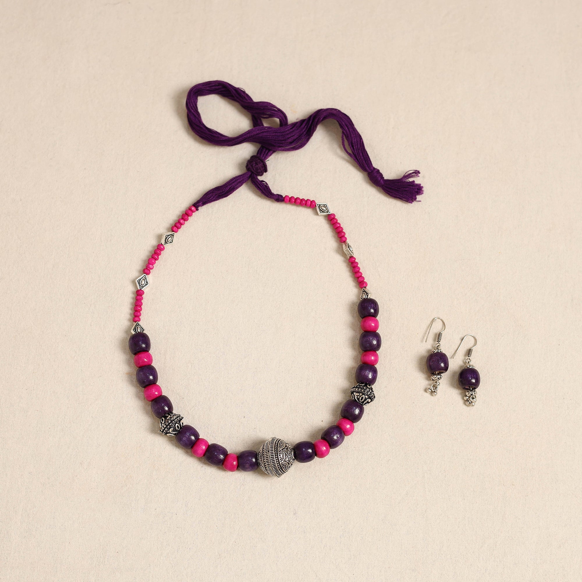 Elevate your ethnic look with this handcrafted purple necklace set, made from german silver and wooden beads. Paired with matching earrings, it’s perfect for festive occasions, cultural events, or adding a distinctive charm to your everyday outfits.