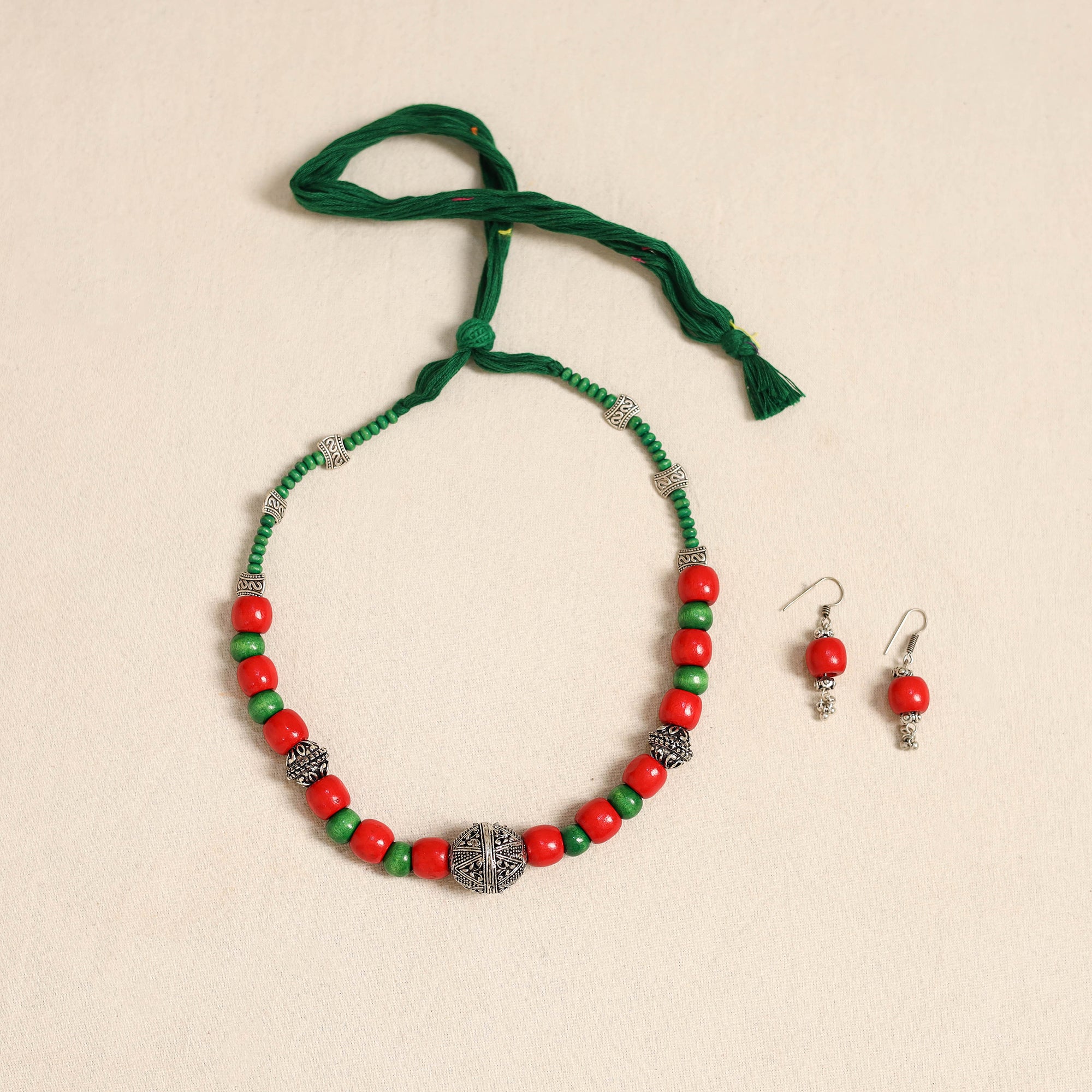 Elevate your ethnic look with this handcrafted red necklace set, made from german silver and wooden beads. Paired with matching earrings, it’s perfect for festive occasions, cultural events, or adding a distinctive charm to your everyday outfits.