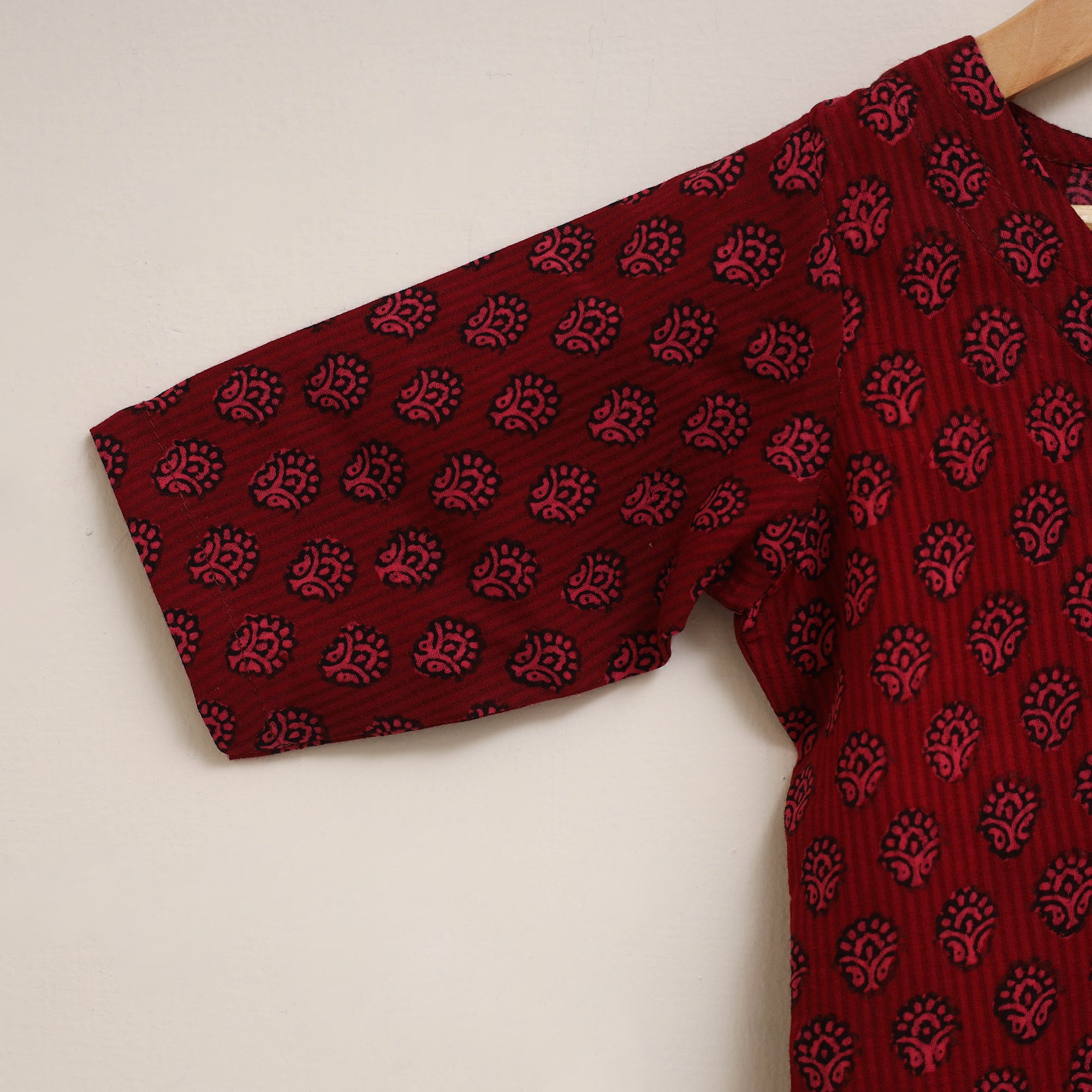| Material | Baby girl's red kurta set paired with matching black plain palazzo with an elasticated waistband. Made from 100% pure cotton using the bagh hand block printing technique, it is comfortable to wear and gentle on the skin, making it suitable for regular wear or outings. |