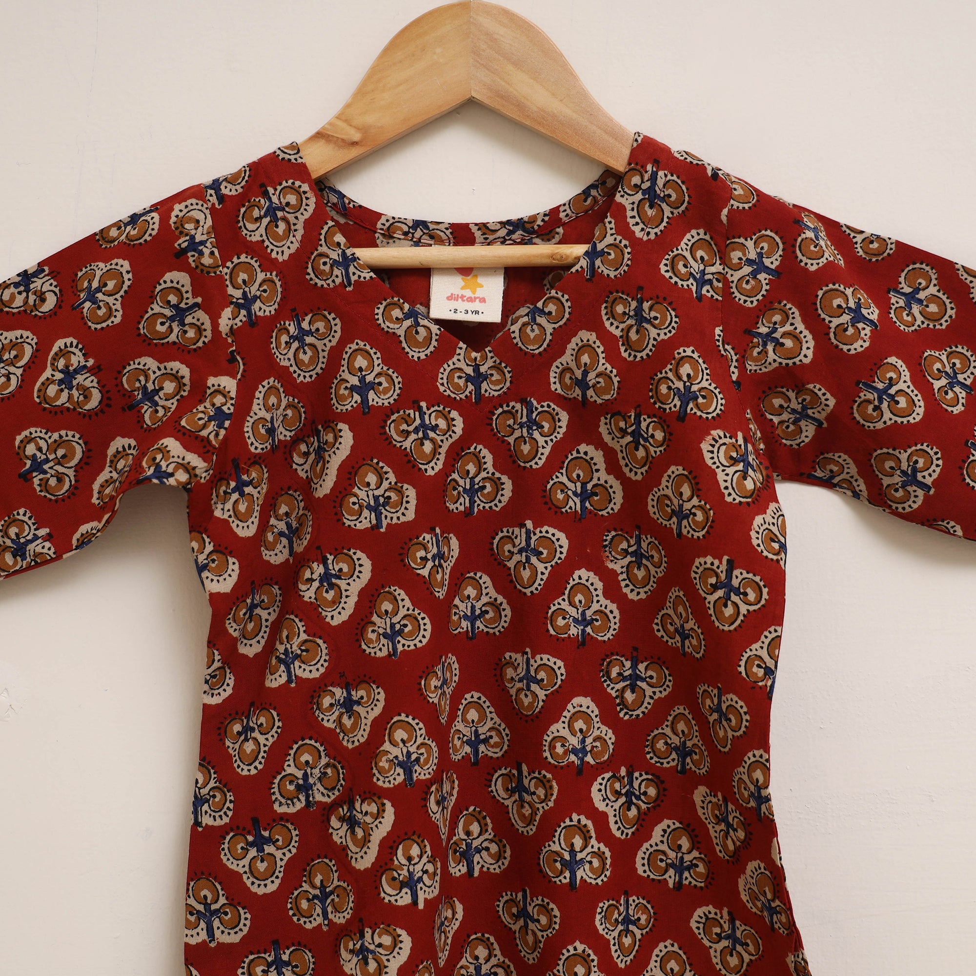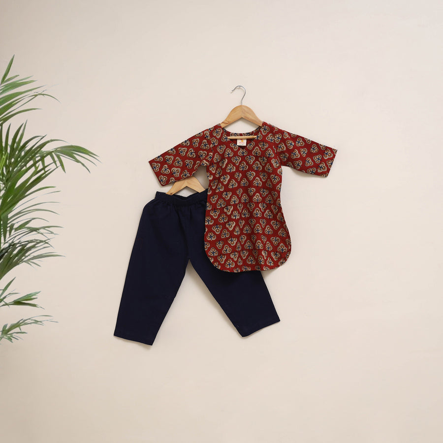 Baby girl's kurta set paired with matching plain palazzo with an elasticated waistband. Made from 100% pure cotton using the bagru hand block printing technique, it is comfortable to wear and gentle on the skin, making it suitable for regular wear or outings.