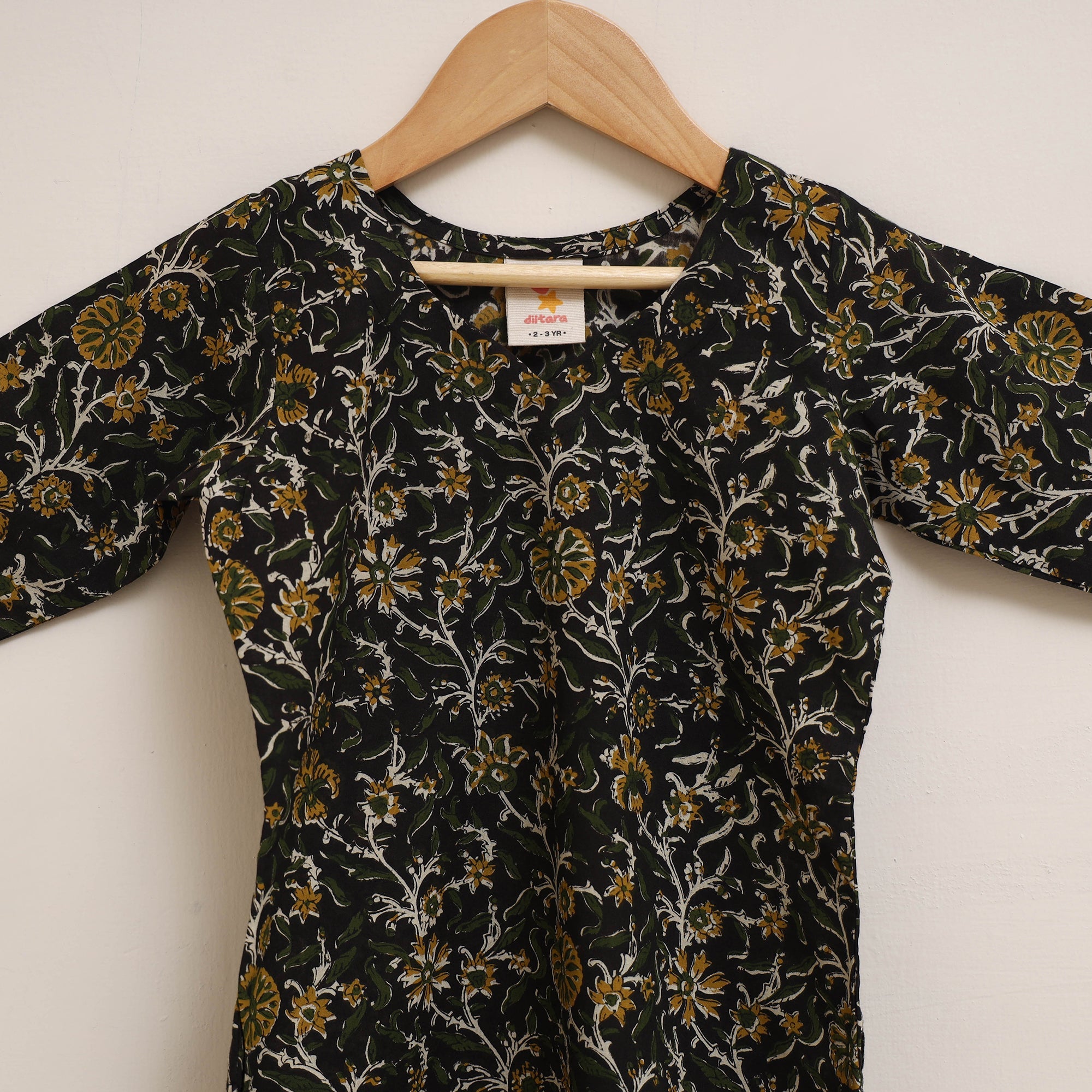 | Material | Baby girl's black kurta set paired with matching black plain palazzo with an elasticated waistband. Made from 100% pure cotton using the bagru hand block printing technique, it is comfortable to wear and gentle on the skin, making it suitable for regular wear or outings. |