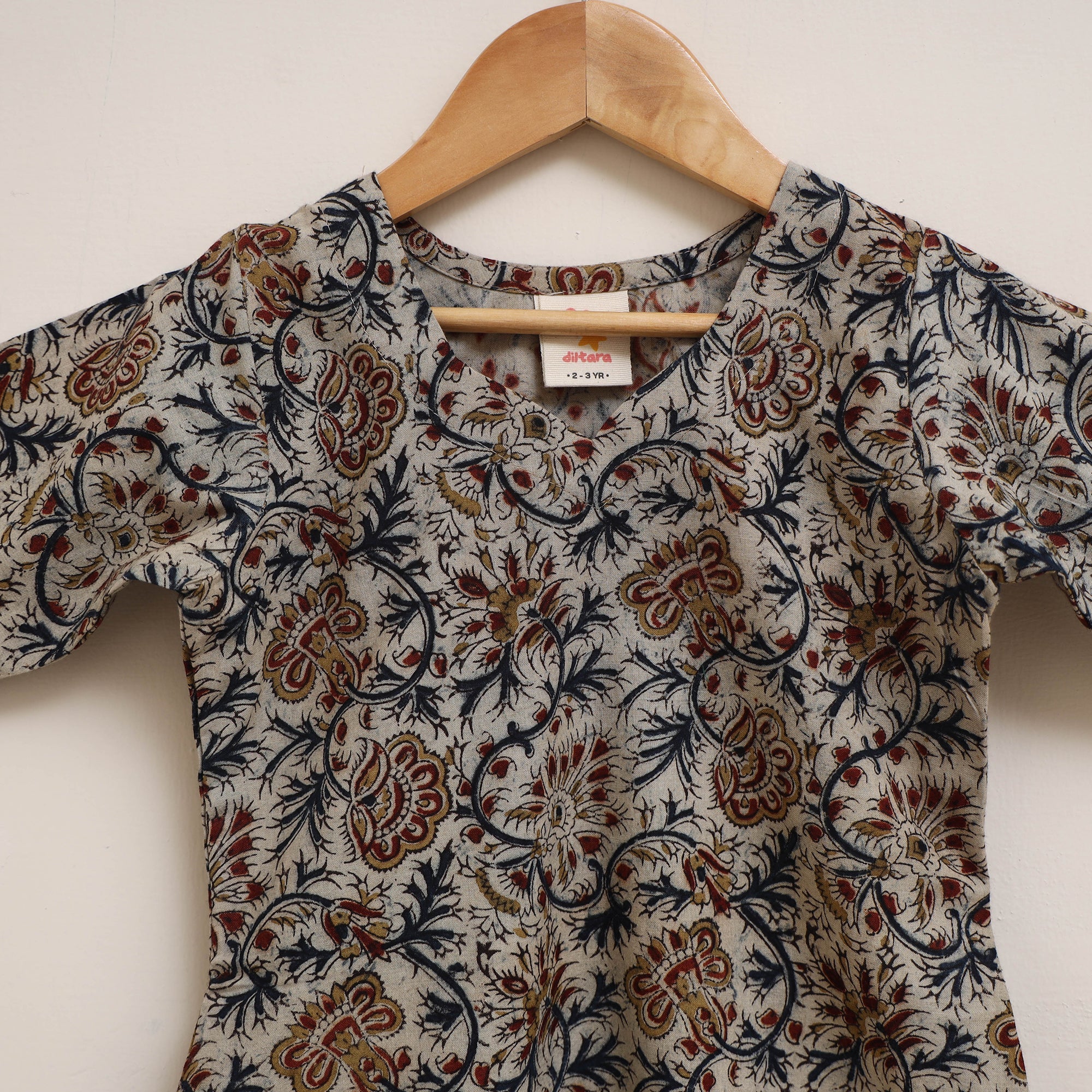 | Material | Baby girl's beige kurta set paired with matching red plain palazzo with an elasticated waistband. Made from 100% pure cotton using the kalamkari hand block printing technique, it is comfortable to wear and gentle on the skin, making it suitable for regular wear or outings. |