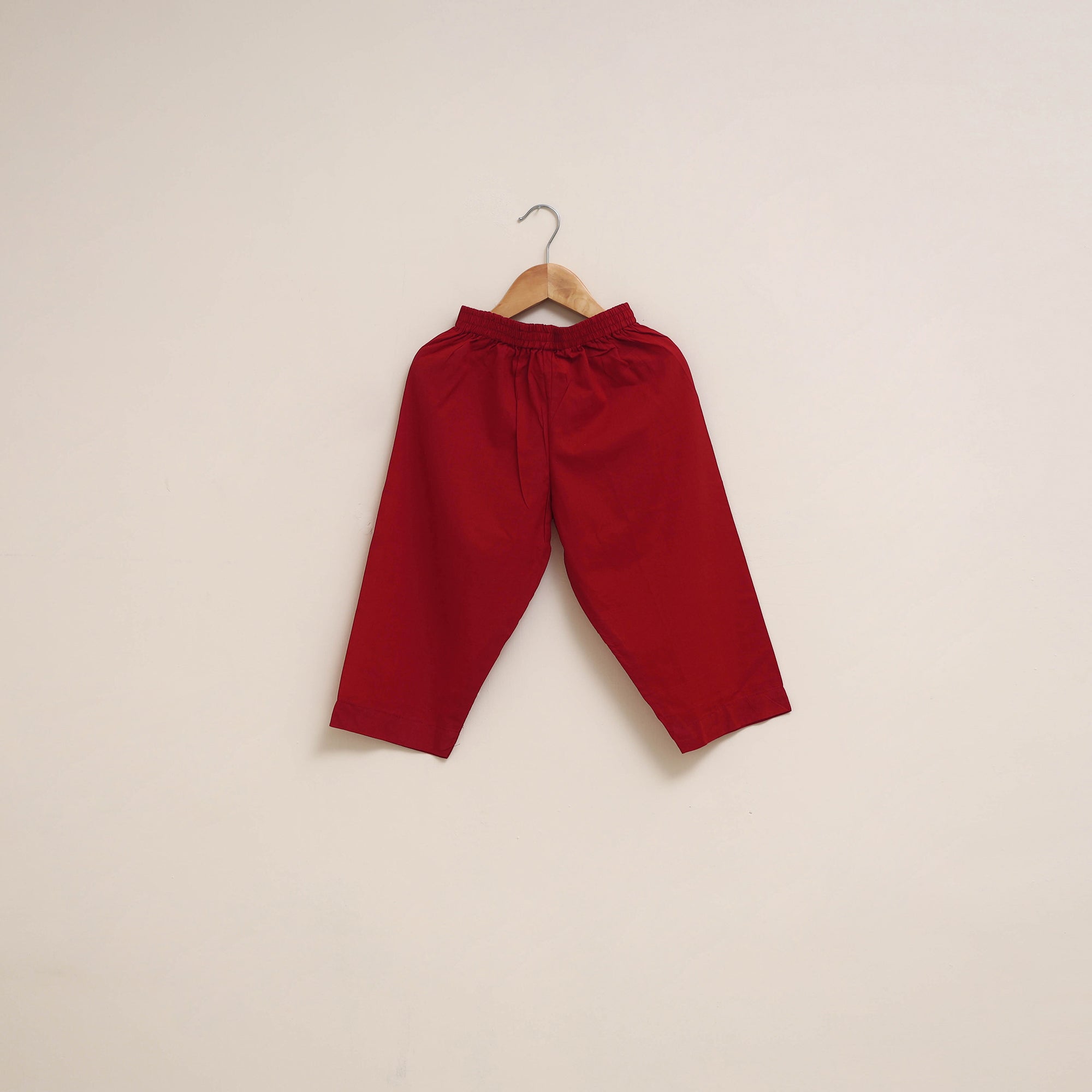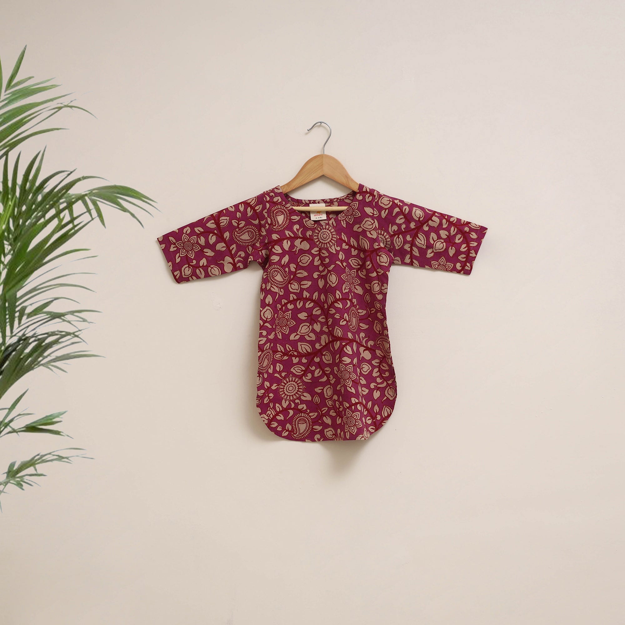| Material | Baby girl's red kurta set paired with matching plain palazzo with an elasticated waistband. Made from 100% pure cotton using the kalamkari screen printing technique, it is comfortable to wear and gentle on the skin, making it suitable for regular wear or outings. |