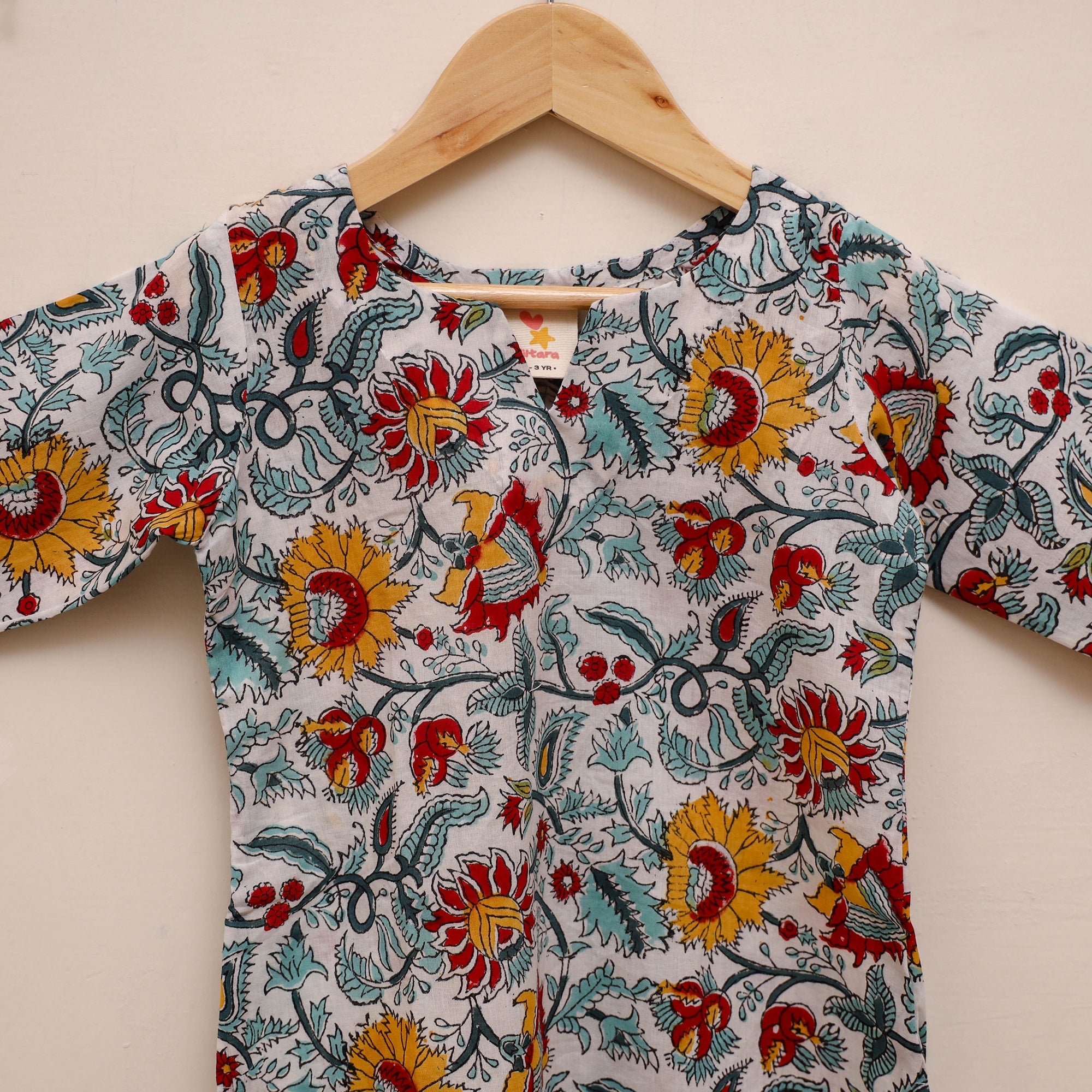 | Material | Girl's kurta set paired with matching plain salwar with an elasticated waistband. Made from 100% pure cotton using the sanganeri hand block printing technique, it is comfortable to wear and gentle on the skin, making it suitable for regular wear or outings. |