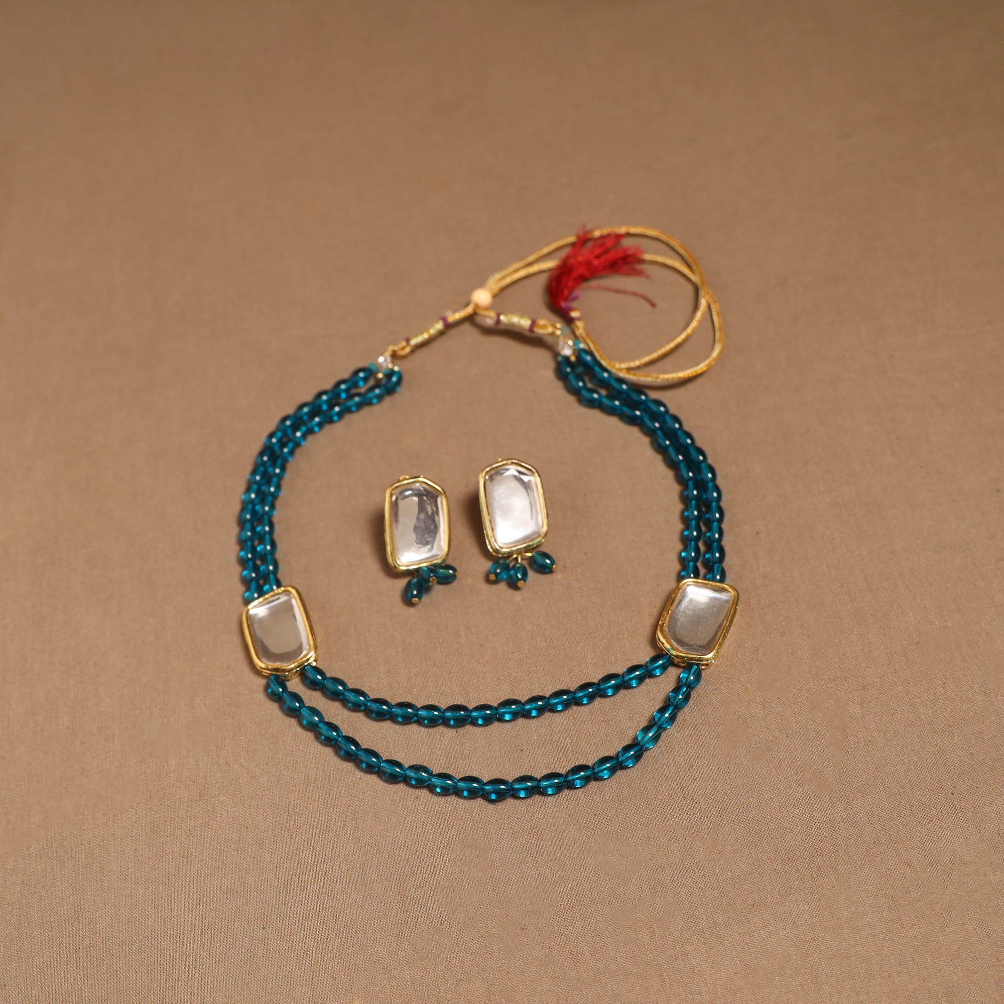 Handmade blue necklace set featuring glass beads & kundan work. It comes with matching earrings for a complete look. Created by artisans, this set is suitable for weddings, cultural functions or for adding a unique flair to everyday style.