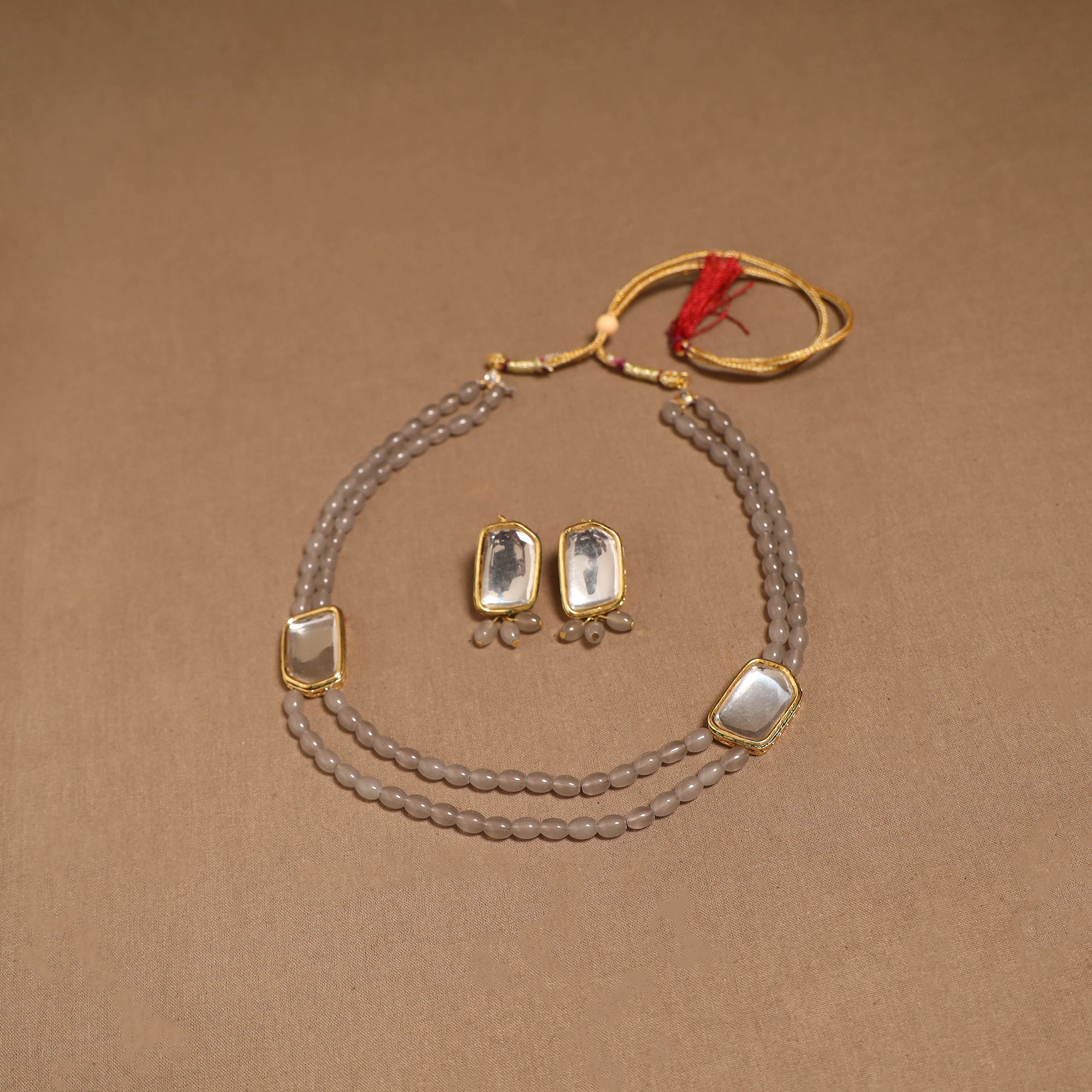 Handmade necklace set featuring glass beads & kundan work. It comes with matching earrings for a complete look. Created by artisans, this set is suitable for weddings, cultural functions or for adding a unique flair to everyday style.