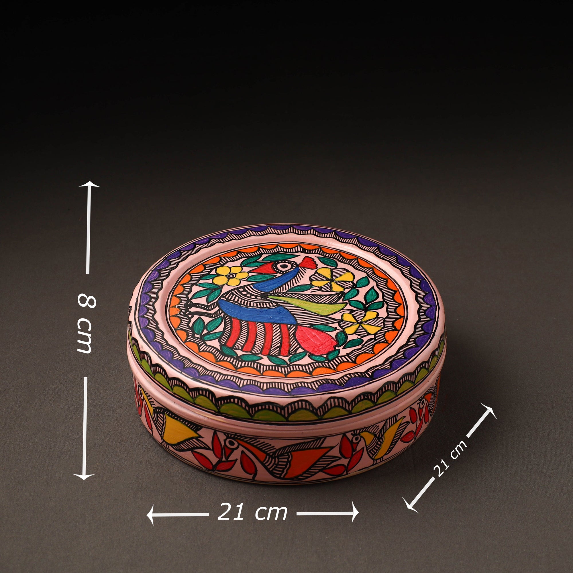 Add a splash of tradition to your kitchen with this pink godna madhubani hand painted stainless steel casserole. Meticulously crafted by artisans, this casserole not only keeps your rotis warm but also celebrates rich folk traditions. Built from sturdy stainless steel and painted with waterproof oil-based colors, it offers both charm and functionality