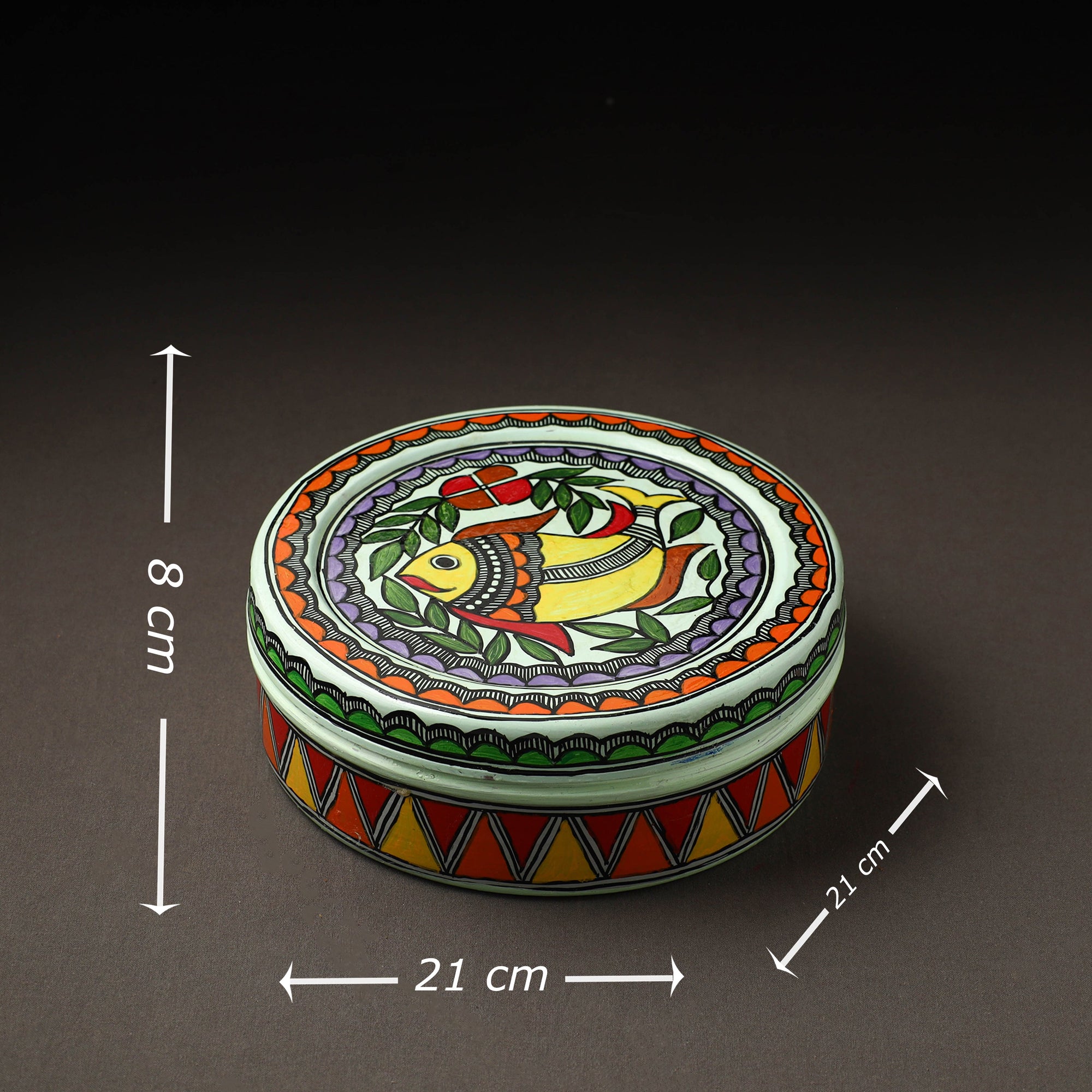 Add a splash of tradition to your kitchen with this green godna madhubani hand painted stainless steel casserole. Meticulously crafted by artisans, this casserole not only keeps your rotis warm but also celebrates rich folk traditions. Built from sturdy stainless steel and painted with waterproof oil-based colors, it offers both charm and functionality