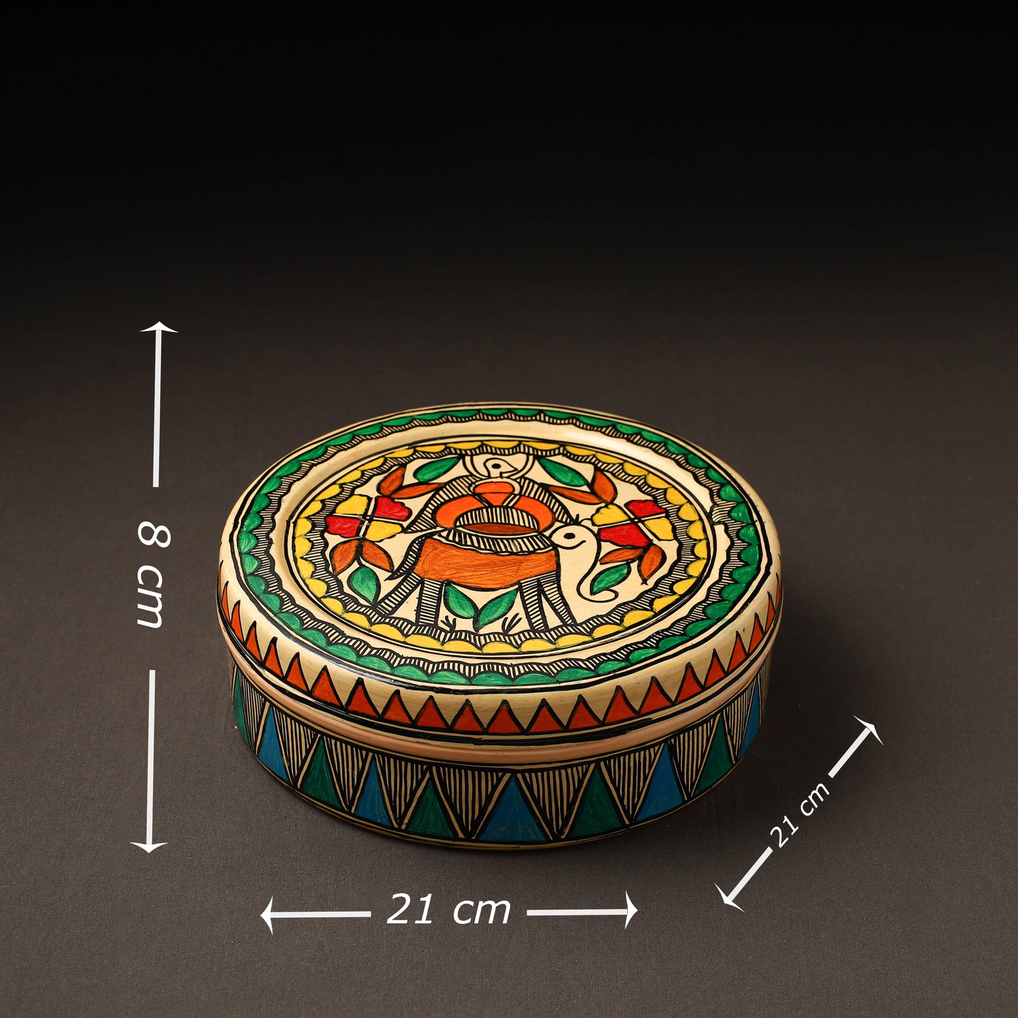 Add a splash of tradition to your kitchen with this beige godna madhubani hand painted stainless steel casserole. Meticulously crafted by artisans, this casserole not only keeps your rotis warm but also celebrates rich folk traditions. Built from sturdy stainless steel and painted with waterproof oil-based colors, it offers both charm and functionality