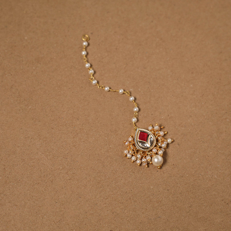 | Material | Gold-plated kundan studded and beaded maang tikka to add a traditional touch to your look. Handmade by artisans, this piece is suitable for ethnic outfits, wedding wear and festive functions. |