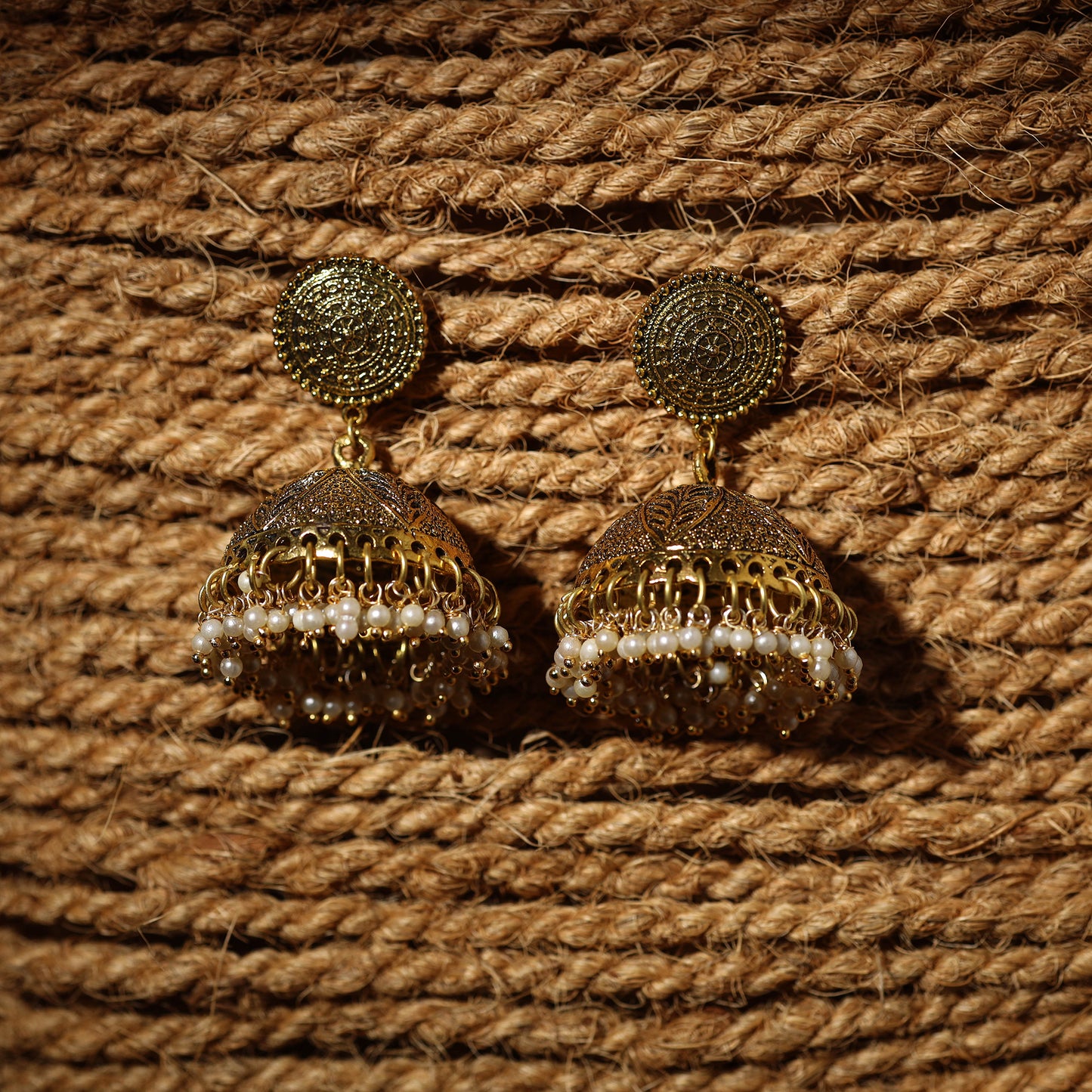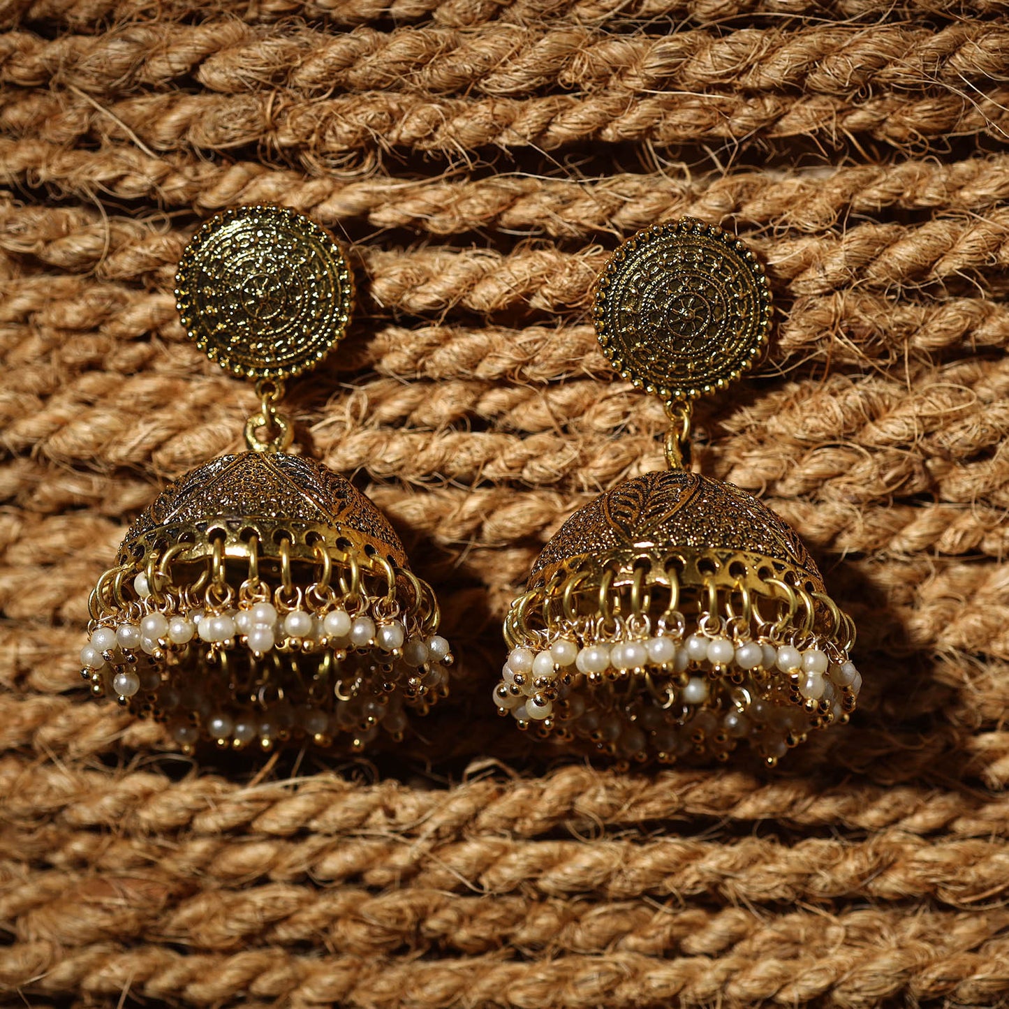Golden handcrafted gs beaded jhumki earrings. Crafted from oxidised german silver adorned with intricate bead work. Perfect for casual outings or festive celebrations they make a versatile addition to any jewelry collection.